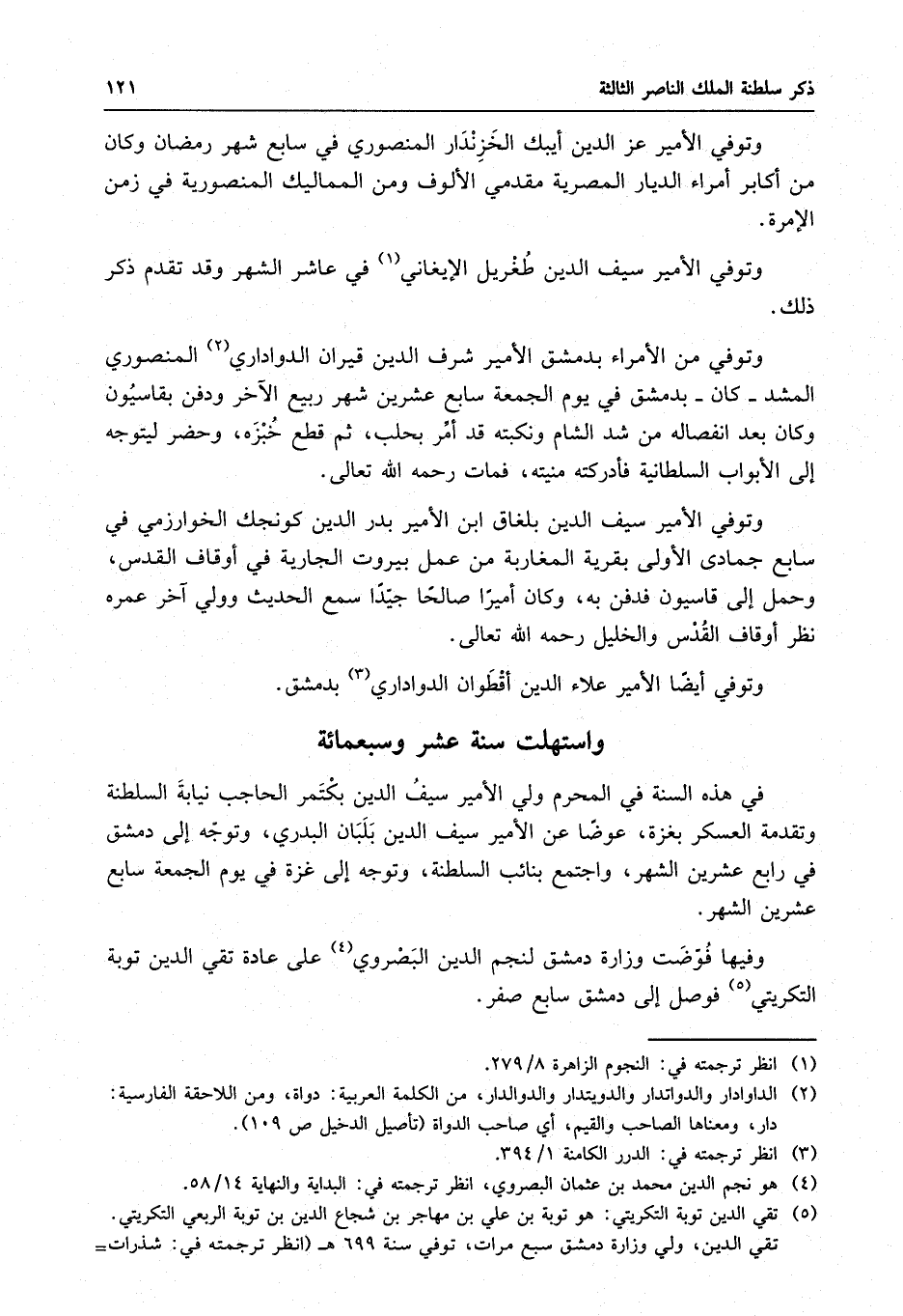 وتوفي الأمير عز الدين أيبك الخزندار المنصوري في سابع شهر رمضان وكان