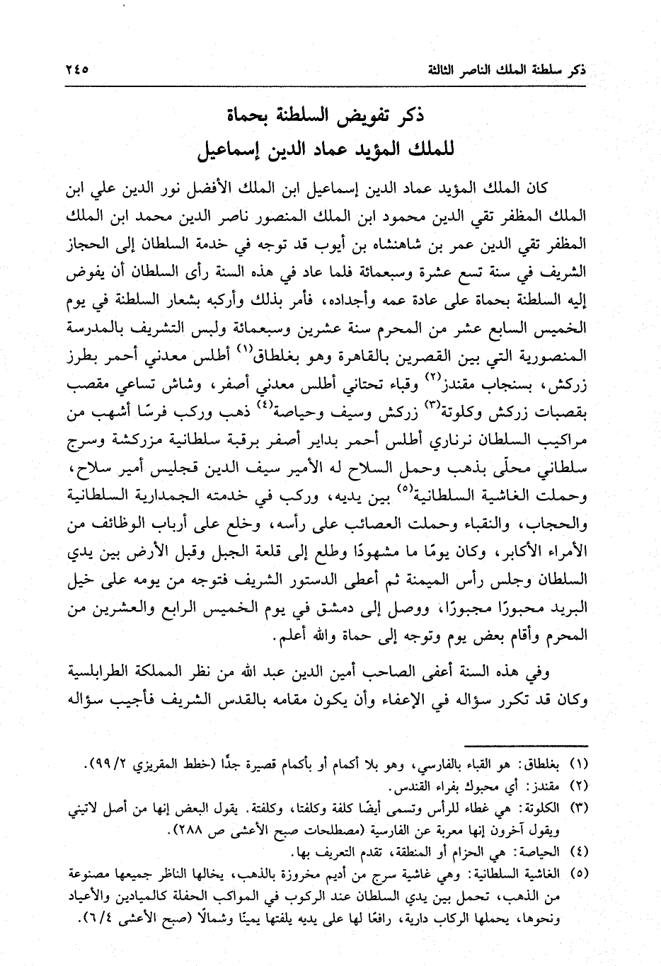 إليه السلطنة بحماة على عادة عمه وأجداده ، فأمر بذلك وأركبه بشعار السلطنة في يوم