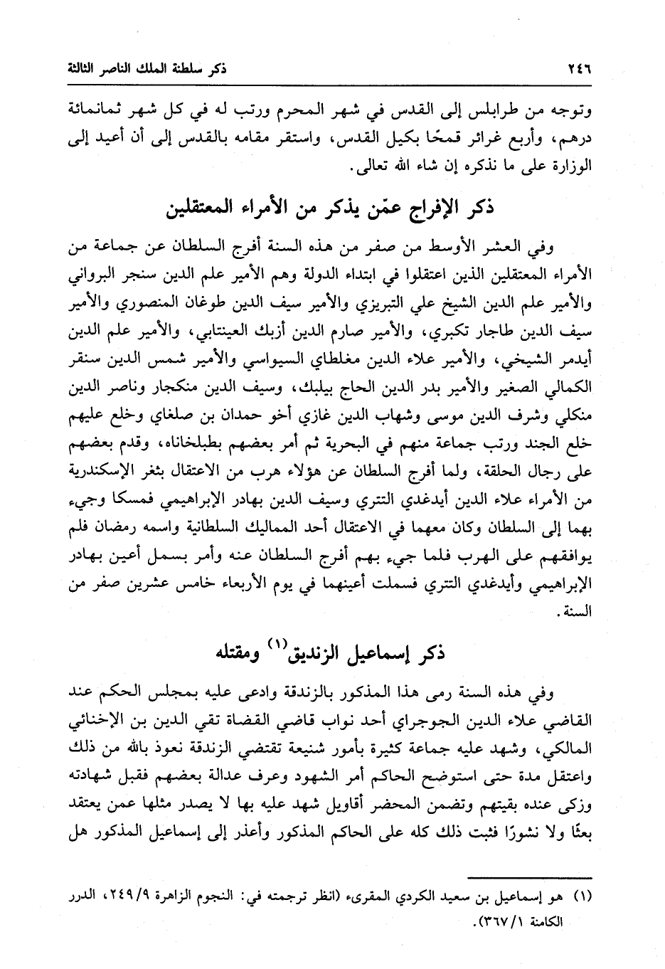 وفي العشر الأوسط من صفر من هذه السنة أفرج السلطان عن جماعة من