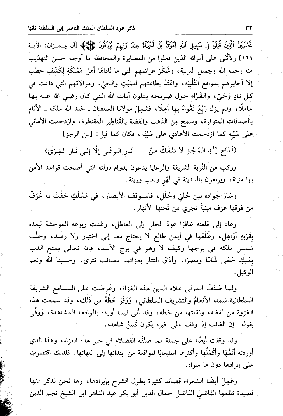 بملك حمى شاما ومصرا ، وأذاق التتار بعزائمه مصائب تترى . وحسبنا الله ونعم