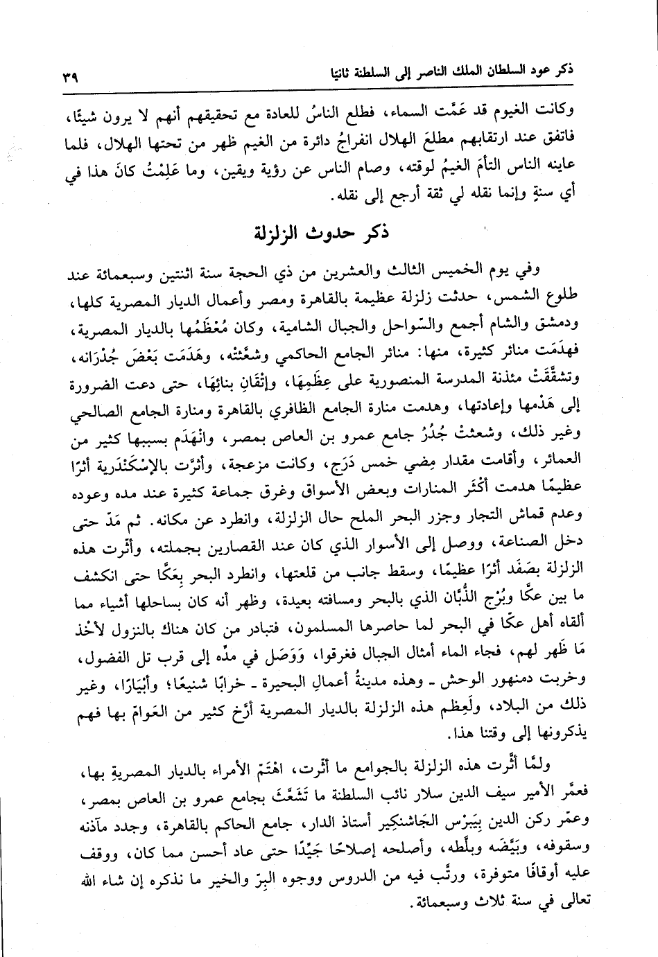 طلوع الشمس ، حدثت زلزلة عظيمة بالقاهرة ومصر وأعمال الديار المصرية كلها ،