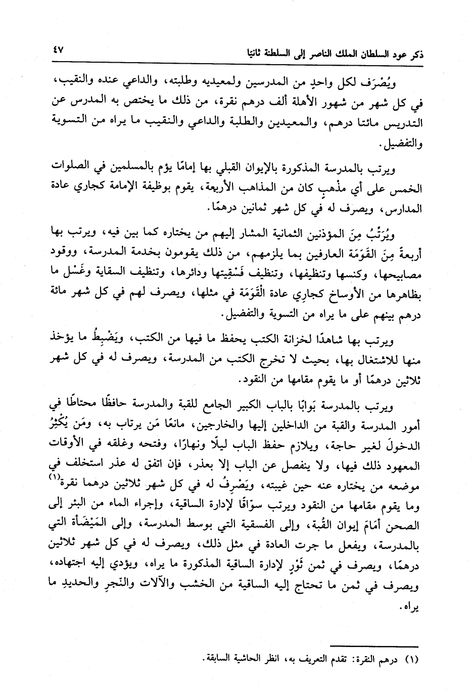 في كل شهر من شهور الأهلة ألف درهم نقرة ، من ذلك ما يختص به المدرس عن