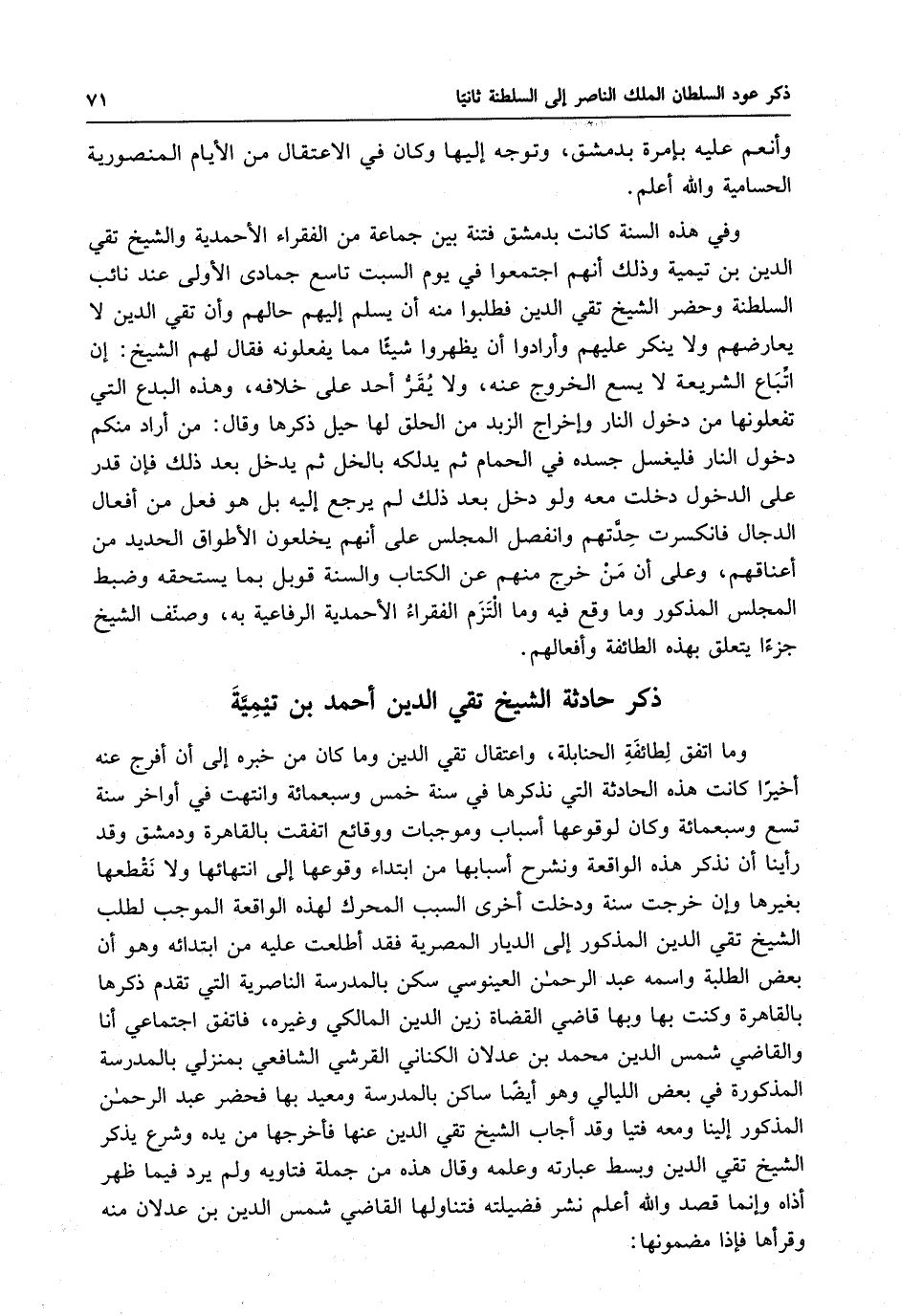 وما اتفق لطائفة الحنابلة ، واعتقال تقي الدين وما كان من خبره إلى أن أفرج عنه