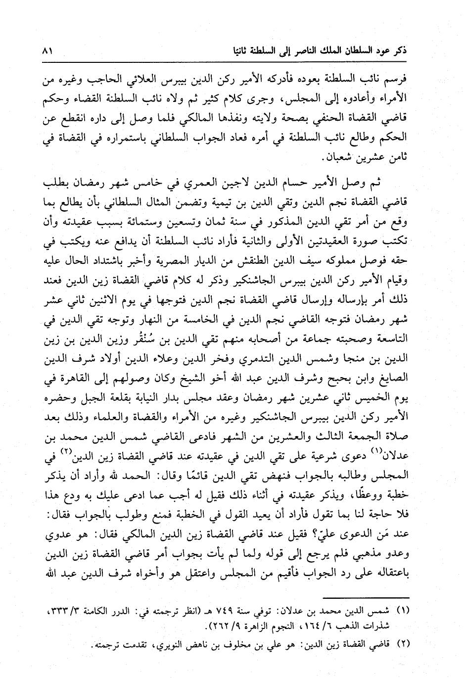 قاضي القضاة نجم الدين وتقي الدين بن تيمية وتضمن المثال السلطاني بأن يطالع بما