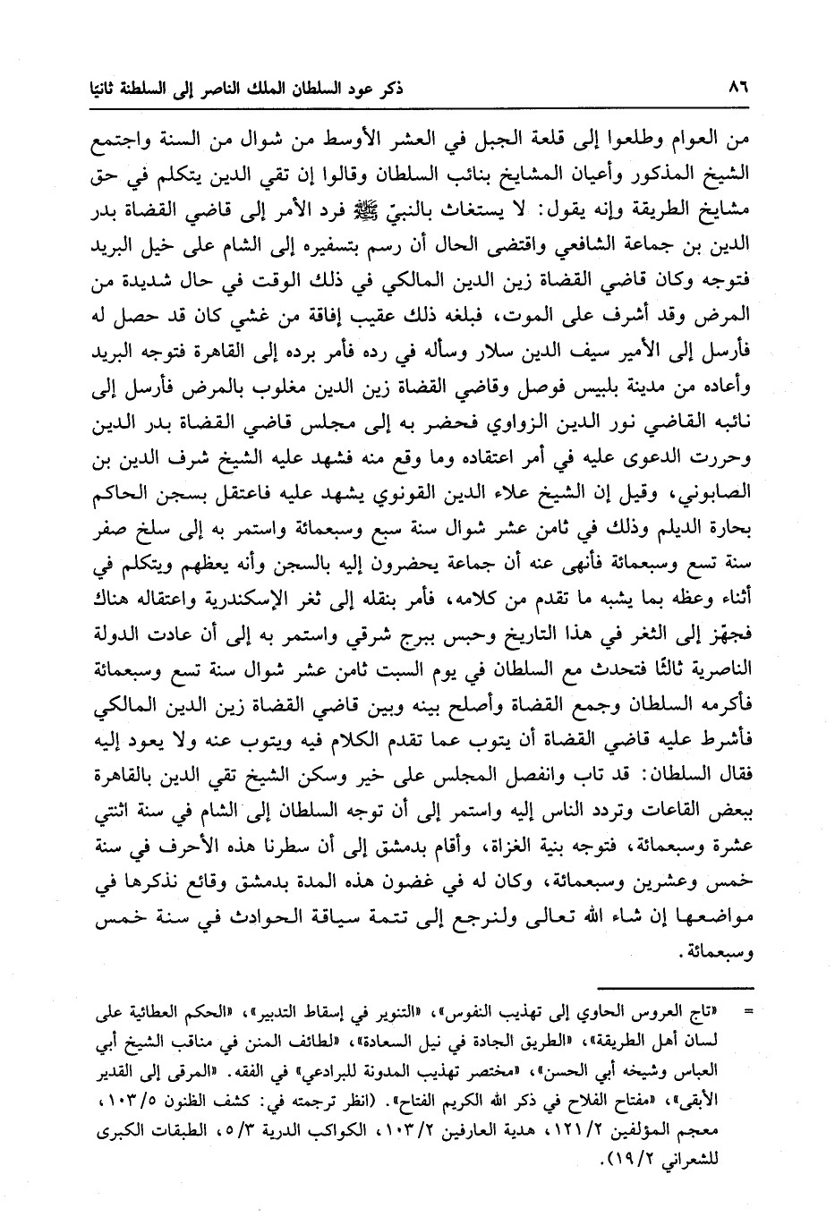 فأكرمه السلطان وجمع القضاة وأصلح بينه وبين قاضي القضاة زين الدين المالكي