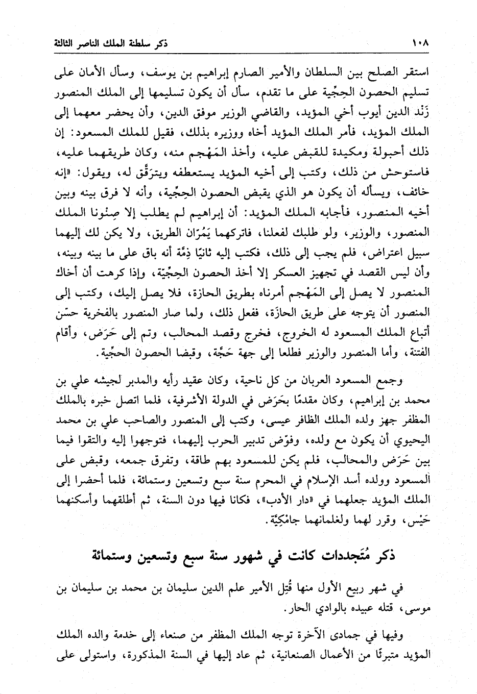 المؤيد متبرئا من الأعمال الصنعانية ، ثم عاد إليها في السنة المذكورة ، واستولى على