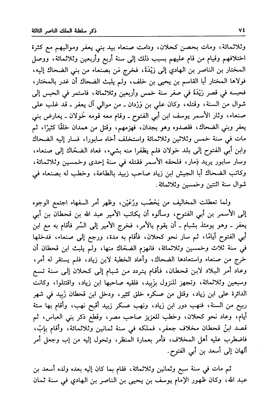 وثلاثمائة ، ومات بحصن كحلان ، ودامت صنعاء بيد بني يعفر ومواليهم مع كثرة