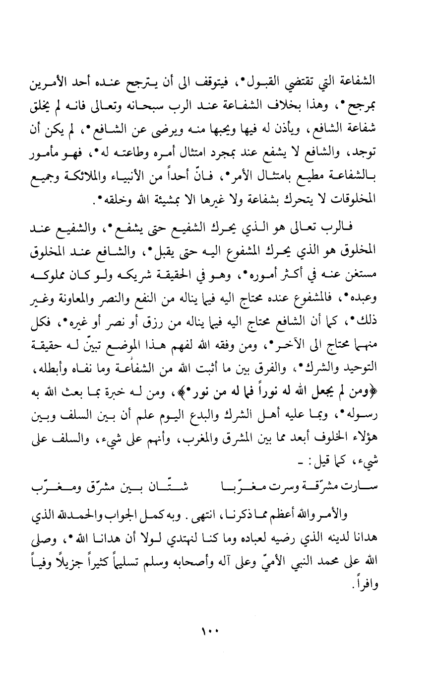 فالرب تعالى هو الذي يحرك الشفيع حتى يشفع والشفيع عند المخلوق هو الذي يحرك المشفوع إليه حتى يقبل والشافع عند المخلوق مستغن عنه في أكثر أموره وهو في الحقيقة شريكه ولو كان مملوكه وعبده فالمشفوع عنده محتاج إليه فيما يناله من النفع والنصر والمعاونة وغير ذلك كما أن الشافع محتاج إليه فيما يناله من رزق أو نصر أو غيره فكل منها محتاج إلى الآخر ومن وفقه الله لفهم هذا الموضع تبين له حقيقة التوحيد والشرك والفرق بين ما أثبت الله من الشفاعة وما نفاه وأبطله {وَمَنْ لَمْ يَجْعَلِ اللَّهُ لَهُ نُوراً فَمَا لَهُ مِنْ نُورٍ} ومن له خبرة بما بعث الله به رسوله وبما عليه الشرك والبدع اليوم علم أن بين السلف وبين هؤلاء الخلوف أبعد مما بين المشرق والمغرب وأنهم على شيء والسلف على شيء كما قيل: