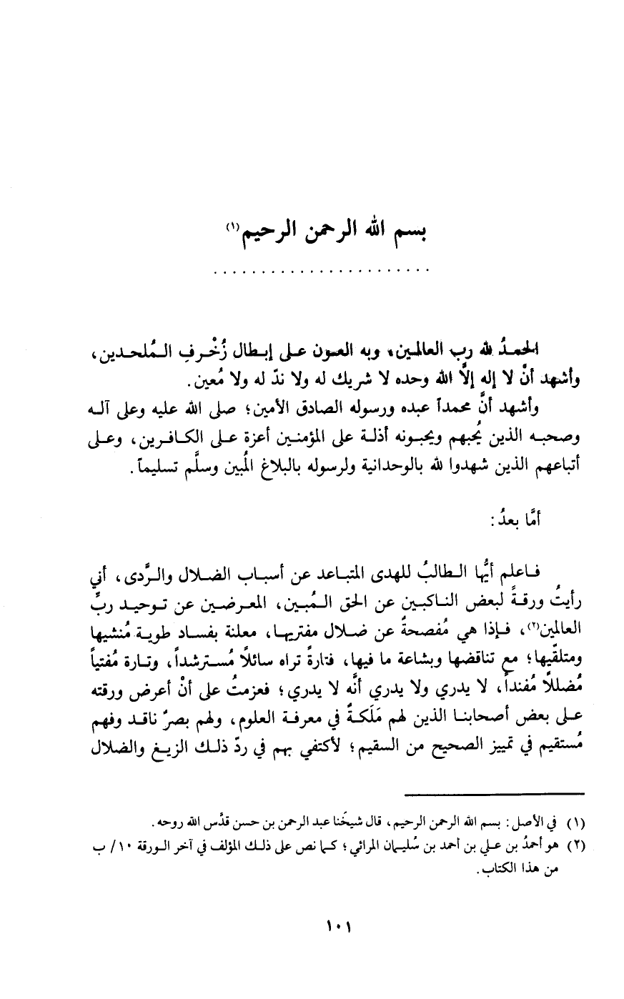 فاعلم أيها الطالب للهدى المتباعد عن أسباب الضلال والردى أني رأيت ورقة لبعض الناكبين عن الحق المبين المعرضين عن توحيد رب العالمين2 فإذا هي مفصحة عن ضلال مفتريها معلنة بفساد طوية منشيها ومتلقيها مع تناقضها وبشاعة ما فيها فتارة تراه سائلا مسترشدا وتارة مفتيا مضللا مفندا لا يدري ولا يدري أنه فعزمت على أن أعرض ورقته على بعض أصحابنا الذين لهم ملكة في معرفة العلوم ولهم بصر ناقد وفهم مستقيم في تمييز الصحيح من السقيم لأكتفي بهم في رد ذلك الزيغ والضلال