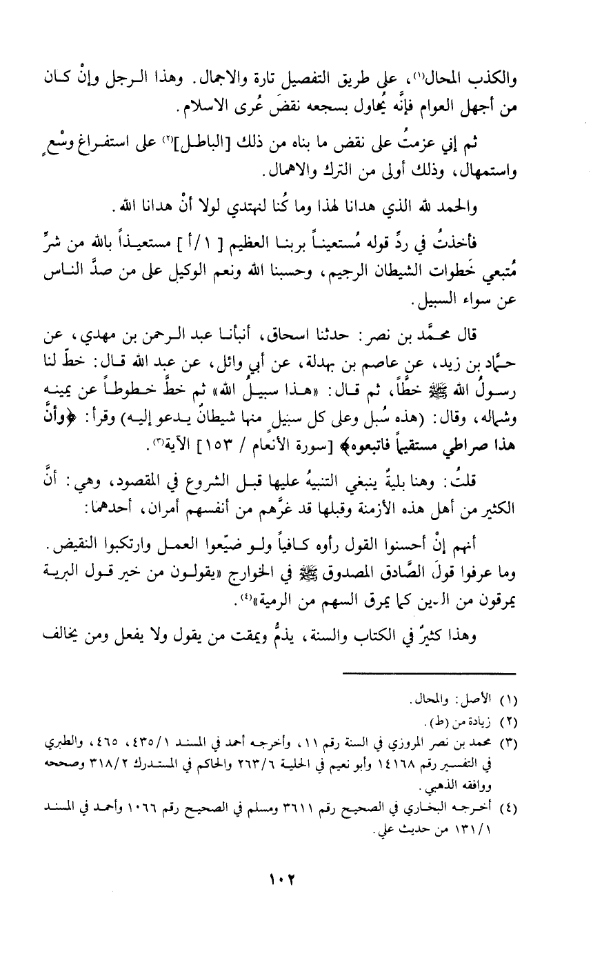 قال محمد بن نصر: حدثنا إسحاق3 أنبأنا عبد الرحمن بن مهدي عن حماد بن زيد عن عاصم بن بهدلة عن أبي وائل عن عبد الله قال: خط لنا رسول الله صلى الله عليه وسلم خطا ثم قال: "هذا سبيل الله" ثم خط خطوطا عن يمينه وشماله وقال: "هذا سبل وعلى كل سبيل منها شيطان يدعوا إليه" وقرأ: {وَأَنَّ هَذَا صِرَاطِي مُسْتَقِيماً فَاتَّبِعُوهُ} [سورة الأنعام: 153] الآية4