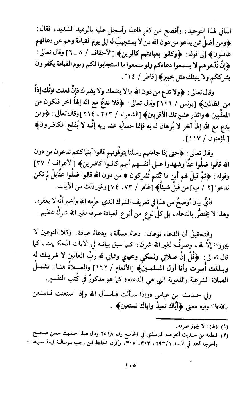 والتحقيق أن الدعاء نوعان: دعاء مسألة, ودعاء وعبادة. وكلا النوعين لا يجوز1 إلا الله وصرفه لغير الله شرك ما سبق بيانه في الآيات المحكمات كما قال تعالى: {قُلْ إِنَّ صَلاتِي وَنُسُكِي وَمَحْيَايَ وَمَمَاتِي لِلَّهِ رَبِّ الْعَالَمِينَ لا شَرِيكَ لَهُ وَبِذَلِكَ أُمِرْتُ وَأَنَا أَوَّلُ الْمُسْلِمِينَ} [الأنعام: 162] والصلاة هنا: تشمل الصلاة الشرعية واللغوية التي هي الدعاء كما هو مذكور في كتب التفسير.