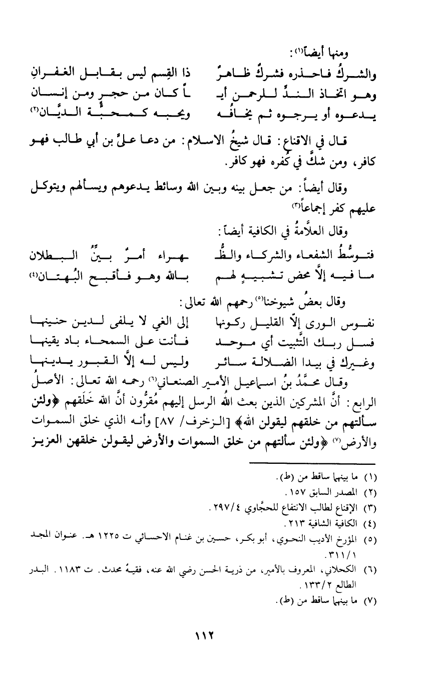 وقال محمد بن اسماعيل الأمير الصنعاني6 رحمه الله: تعالى: الأصل الرابع: أن المشركين الذين بعث الله الرسل إليهم مقرون أن الله خلقهم {وَلَئِنْ سَأَلْتَهُمْ مَنْ خَلَقَهُمْ لَيَقُولُنَّ اللَّهُ} [الزخرف: 87] وأنه الذي خلق السموات والأرض7 {وَلَئِنْ سَأَلْتَهُمْ مَنْ خَلَقَ السَّمَاوَاتِ وَالْأَرْضَ لَيَقُولُنَّ خَلَقَهُنَّ الْعَزِيزُ