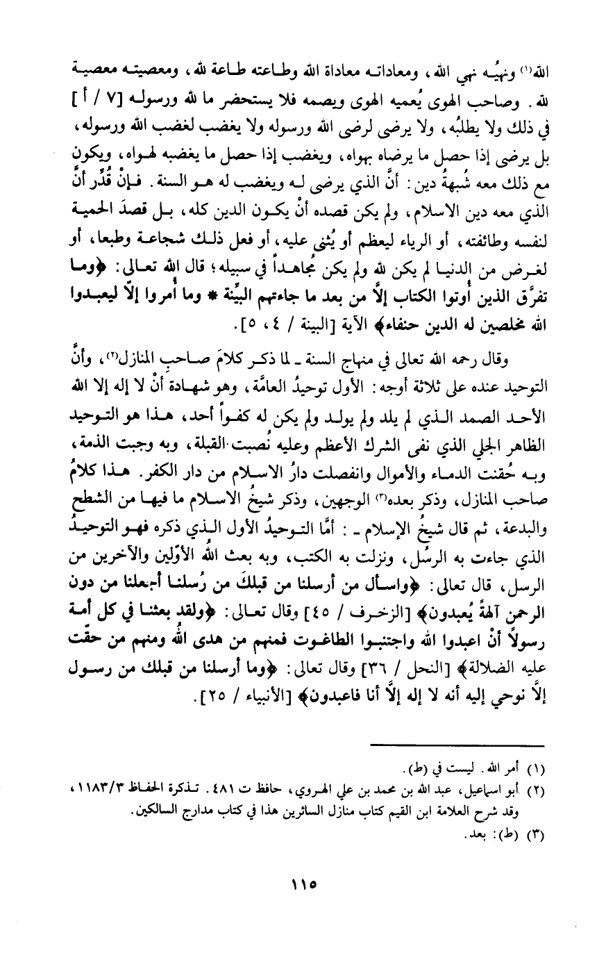 وقال رحمه الله: تعالى: في منهاج السنة – لما ذكر كلام صاحب المنازل2 وأن التوحيد عنده على ثلاثة أوجه: الأول توحيد العامة وهو شهادة أن لا إله إلا الله الأحد الصمد الذي لم يلد ولم يولد ولم يكن له كفوا أحد, هذا هو توحيد الظاهر الجلي الذي نفى الشرك الأعظم وعليه نصبت القبلة وبه وجبت الذمة وبه حقنت الدماء والأموال وانفصلت دار الإسلام من دار الكفر هذا كلام صاحب المنازل وذكر بعده3 الوجهين وذكر شيخ الإسلام ما فيها من الشطح والبدعة ثم قال شيخ الإسلام-: أما التوحيد الأول الذي ذكره فهو التوحيد الذي جاءت به الرسل ونزلت به الكتب وبه بعث الله الأولين والآخرين من الرسل قال تعالى: {وَاسْأَلْ مَنْ أَرْسَلْنَا مِنْ قَبْلِكَ مِنْ رُسُلِنَا أَجَعَلْنَا مِنْ دُونِ الرَّحْمَنِ آلِهَةً يُعْبَدُونَ} [الزخرف: 45] وقال تعالى: {وَلَقَدْ بَعَثْنَا فِي كُلِّ أُمَّةٍ رَسُولاً أَنِ اعْبُدُوا اللَّهَ وَاجْتَنِبُوا الطَّاغُوتَ فَمِنْهُمْ مَنْ هَدَى اللَّهُ وَمِنْهُمْ مَنْ حَقَّتْ عَلَيْهِ الضَّلالَةُ} [النحل: 36] وقال تعالى: {وَمَا أَرْسَلْنَا مِنْ قَبْلِكَ مِنْ رَسُولٍ إِلَّا نُوحِي إِلَيْهِ أَنَّهُ لا إِلَهَ إِلَّا أَنَا فَاعْبُدُونِ} [الأنبياء:25] .