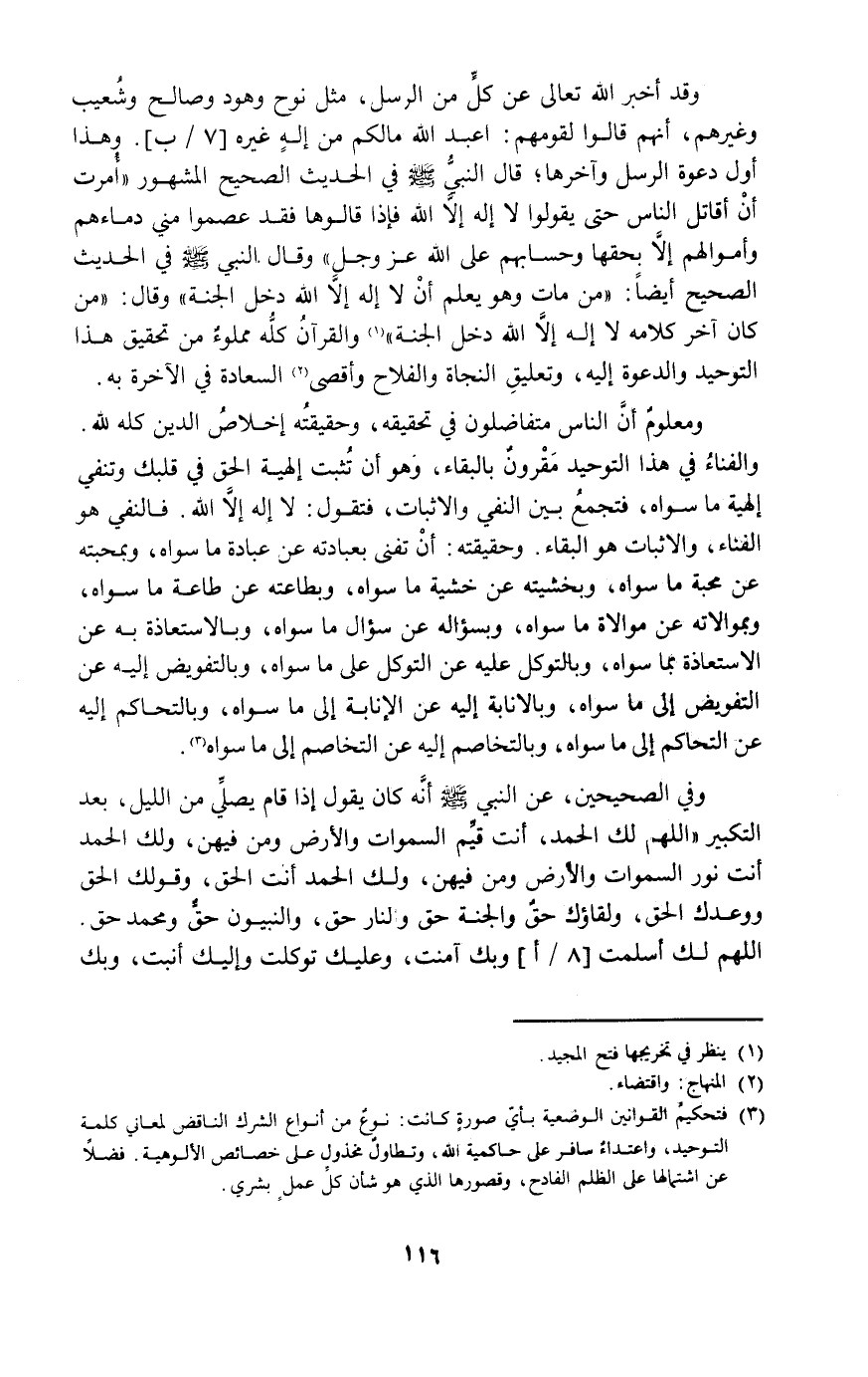 ومعلوم أن الناس متفاضلون في تحقيقه وحقيقته إخلاص الدين كله لله والفناء في هذا التوحيد مقرون بالبقاء وهو أن تثبت إلهية الحق في قلبك وتنفي إلهية ما سواه فتجمع بين النفي والإثبات فتقول: لا إله إلا الله فالنفي هو الفناء والاثبات هو البقاء وحقيقته: أن تفني بعبادته عن عبادة ما سواه وبمحبته عن محبة ما سواه وبخشيته عن خشية ما سواه وبطاعته عن طاعة ما سواه بموالاته عن موالاة ما سواه وبسؤاله عن سؤال ماسواه وبالاستعاذة به عن الاستعاذة بما سواه وبالتوكل عليه عن التوكل على ما سواه وبالتفويض إليه عن التفويض إلى ما سواه وبالإنابة إليه عن الإنابة إلى ما سواه وبالتحاكم إليه عن التحاكم إلى ماسواه وبالتخاصم إليه عن التخاصم إلى ماسواه3.