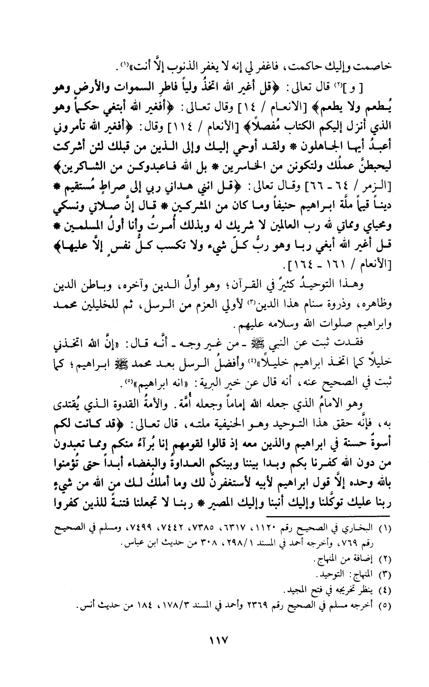 وهذا التوحيد كثير في القرآن وهو أول الدين وآخره وباطن الدين وظاهره وذروة سنام هذا الدين3 لأولي العزم من الرسل ثم للخليلين محمد وإبراهيم صلوات الله وسلامه عليهم.