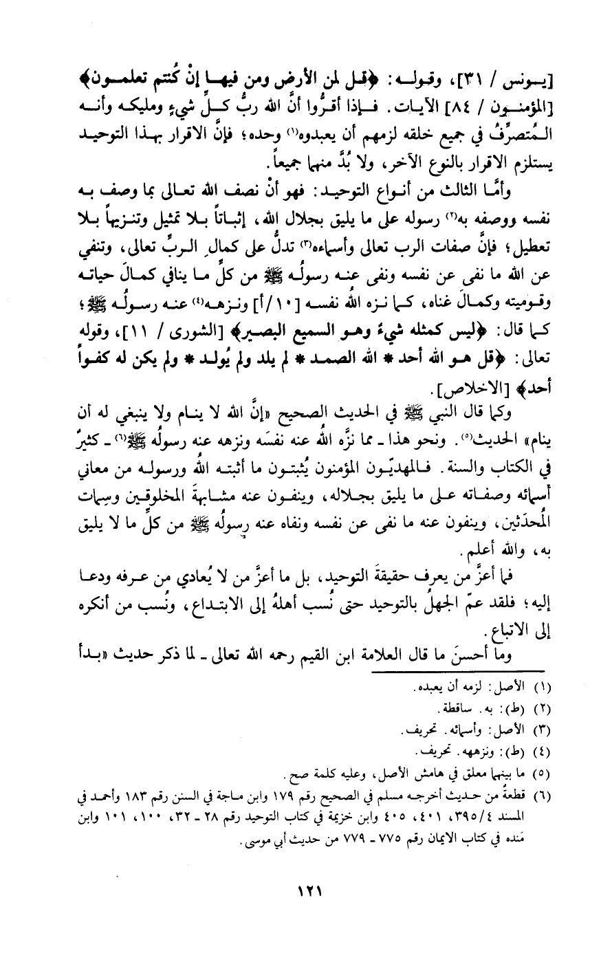 وأما الثالث من أنواع التوحيد: فهو أن نصف الله تعالى بما وصف به نفسه ووصفه به2 رسوله على ما يليق بجلال الله إثباتا بلا تمثيل وتنزيها بلا تعطيل فإن صفات الرب تعالى وأسماءه3 تدل على كمال الرب تعالى وتنفي عن الله ما نفى عن نفسه ونفى عنه رسوله صلى الله عليه وسلم من كل ما ينافي كمال حياته وقوميته وكمال غناه كما نزهه الله نفسه ونزهه4 عنه رسوله صلى الله عليه وسلم كما قال: ِ {لَيْسَ كَمِثْلِهِ شَيْءٌ وَهُوَ السَّمِيعُ الْبَصِيرُ} [الشورى: 11] وقوله تعالى: {قُلْ هُوَ اللَّهُ أَحَدٌ اللَّهُ الصَّمَدُ لَمْ يَلِدْ وَلَمْ يُولَدْ وَلَمْ يَكُنْ لَهُ كُفُواً أَحَدٌ} [الإخلاص] .