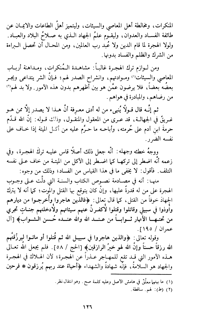المنكرات ومخالطة أهل المعاصي والسيئات وليتميز أهل الطاعات والأيمان عن طائفة الفساد والعدوان وليقوم علم الجهاد الذي به صلاح البلاد والعباد ولولا الهجرة لما قام الدين ولا عبد رب العالمين ومن المحال أن تحصل البراءة من الشرك والظلم والفساد بدونها.
