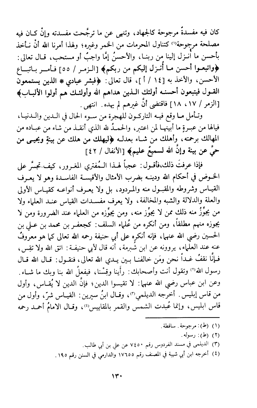 فإذا عرفت ذلك؛ فأقول عجبا لهذا المفتري المغرور كيف تجسر على الخوض في أحكام الله ودينه بضرب الأمثال والأقيسة الفاسدة وهو لا يعرف القياس وشروطه والمقبول منه والمردود بل ولا يعرف أنواعه كقياس الأولى والعلة والدلالة والشبه والمخالفة ولا يعرف مفسدات القياس عند العلماء ولا من يجوز منه ذلك ممن لا يجوز منه ومن يجوز من العلماء عند الضرورة ومن لا يجوز منهم مطلقا ومن أنكره من علماء السلف كجعفر بن محمد بن علي بن الحسين رضي الله عنهما فإن أنكره على أبي حنيفة رحمه الله تعالى: كما هو هو معروف عنه عند العلماء يروونه عن ابن شبرمة أنه قال لأبي حنيفة: اتق الله ولا تقس فإنا نفق غدا نحن ومن خالفنا بين يدي الله تعالى؛ فنقول: قال الله قال رسول الله وتقول: أنت وأصحابك رأينا وقسنا فيفعل الله بنا وبك ما شاء وعن ابن عباس رضي الله عنهما: لا تقيسوا الدين لا يقاس وأول من قاس إبليس الديلمي وقال ابن سيرين: القياس شر وأول من قاس إبليس وإنما عبدت الشمس والقمر بالمقاييس وقال الأمام أحمد رحمه