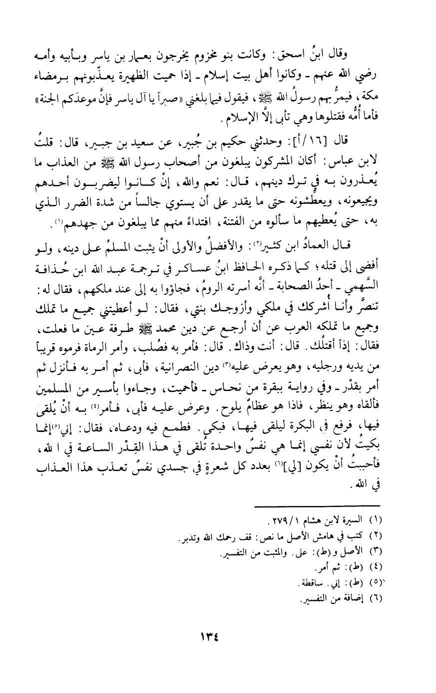 وقال ابن إسحاق: وكانت بنو مخزوم يخرجون بعمار بن ياسر وبأبيه وأمه رضي الله عنهم – وكانوا أهل بيت إسلام – إذا حميت الظهيرة يعذبونهم برمضاء مكة فيمر بهم رسول الله صلى لله عليه وسلم فيقول فيما بلغني "صبرا يا آل ياسر فإن موعدكم الجنة" فأما أمه فقتلوها وهي تأبى إلا الإسلام.