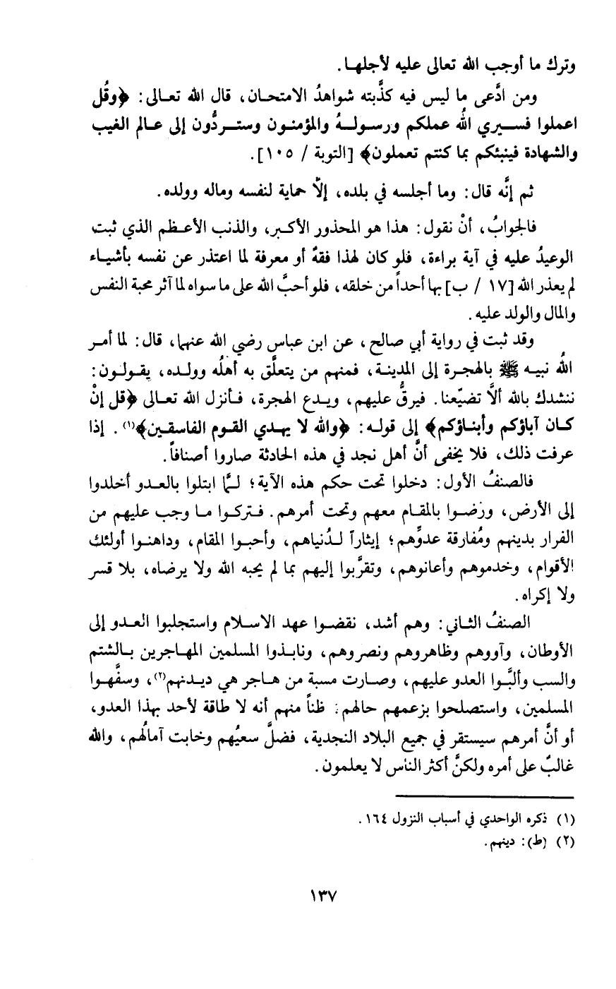وقد ثبت في رواية أبي صالح عن ابن عباس رضي الله عنهما قال: لما أمر الله نبيه صلى الله عليه وسلم بالهجرة إلى المدينة فمنهم من يتعلق به أهله وولده يقولون: ننشدك بالله ألا تضيعنا. فيرق عليهم ويدع الهجرة فأنزل الله تعالى: {قُلْ إِنْ كَانَ آبَاؤُكُمْ وَأَبْنَاؤُكُمْ} إلى قوله: {وَاللَّهُ لا يَهْدِي الْقَوْمَ الْفَاسِقِينَ} 1 إذا عرفت ذلك فلا يخفى أن أهل نجد في هذه الحادثة صاروا أصنافا.