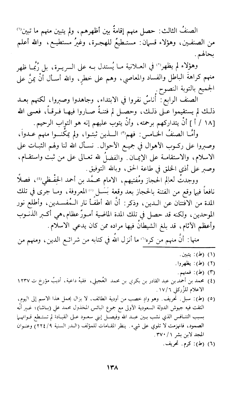 ووجدت لعالم الحجاز ومفتيهم الإمام محمد بن أحمد الحفظي4 فصلا نافعا فيما وقع من الفتنة بالحجاز بعد وقعة بسل5 المعروفة وما جرى في تلك المدة من الافتتان عن الدين وذكر: أن الله أطفأ نار المفسدين وأطلع نور الموحدين ولكنه قد حصل في تلك المدة الماضية أمور عظام هي أكبر الذنوب وأعظم الآثام قد بلغ الشيطان فيها مراده ممن كان يدعي الإسلام.
