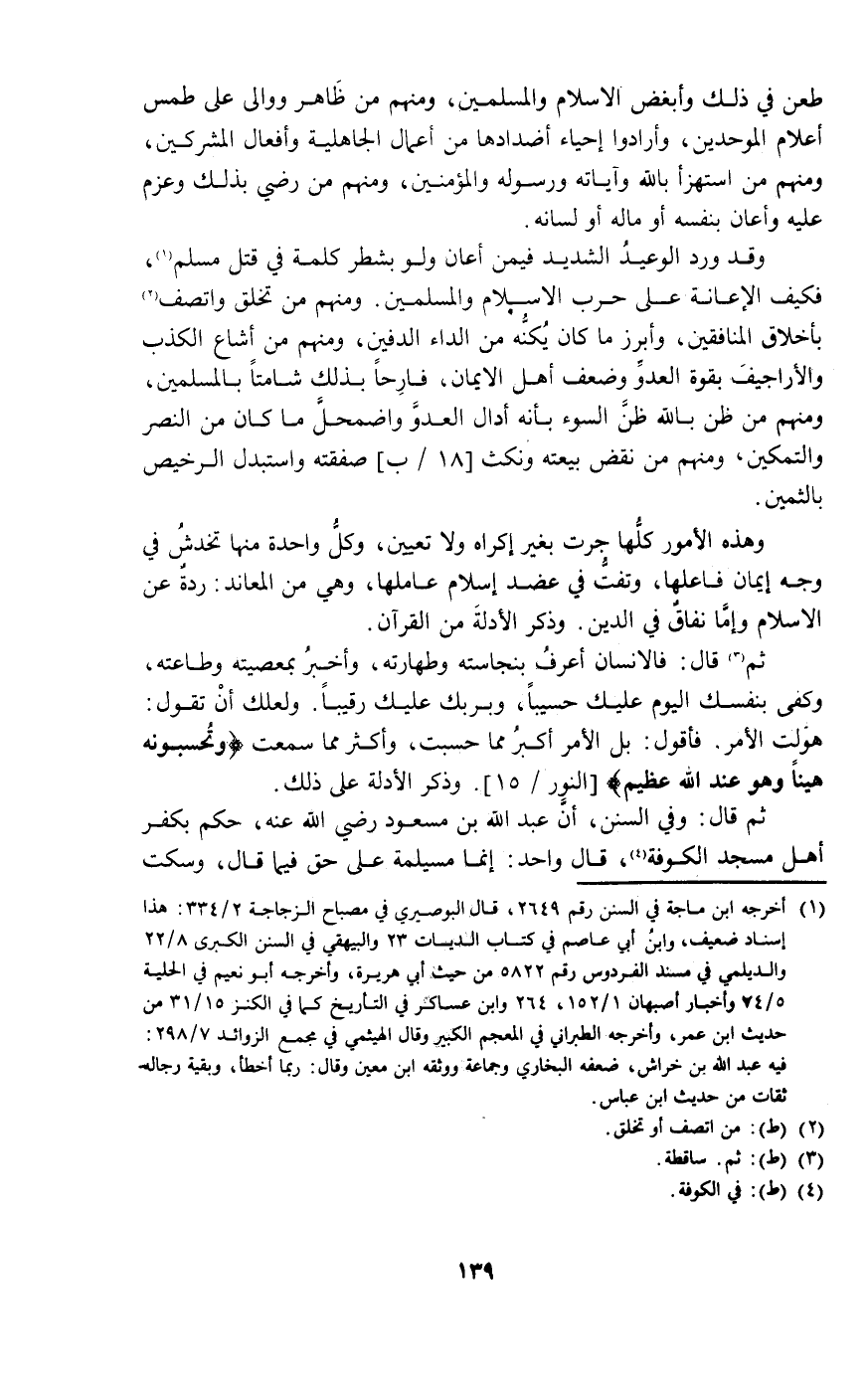 ثم3 قال: فالإنسان أعرف بنجاسته وطهارته وأخبر بمعصيته وطاعته وكفى بنفسك اليوم عليك حسيبا وبربك عليك رقيبا ولعلك أن تقول: هولت الأمر فأقول بل الأمر أكبر مما حسبت وأكثر مما سمعت {وَتَحْسَبُونَهُ هَيِّناً وَهُوَ عِنْدَ اللَّهِ عَظِيمٌ} [النور: 15] وذكر الأدلة على ذلك: