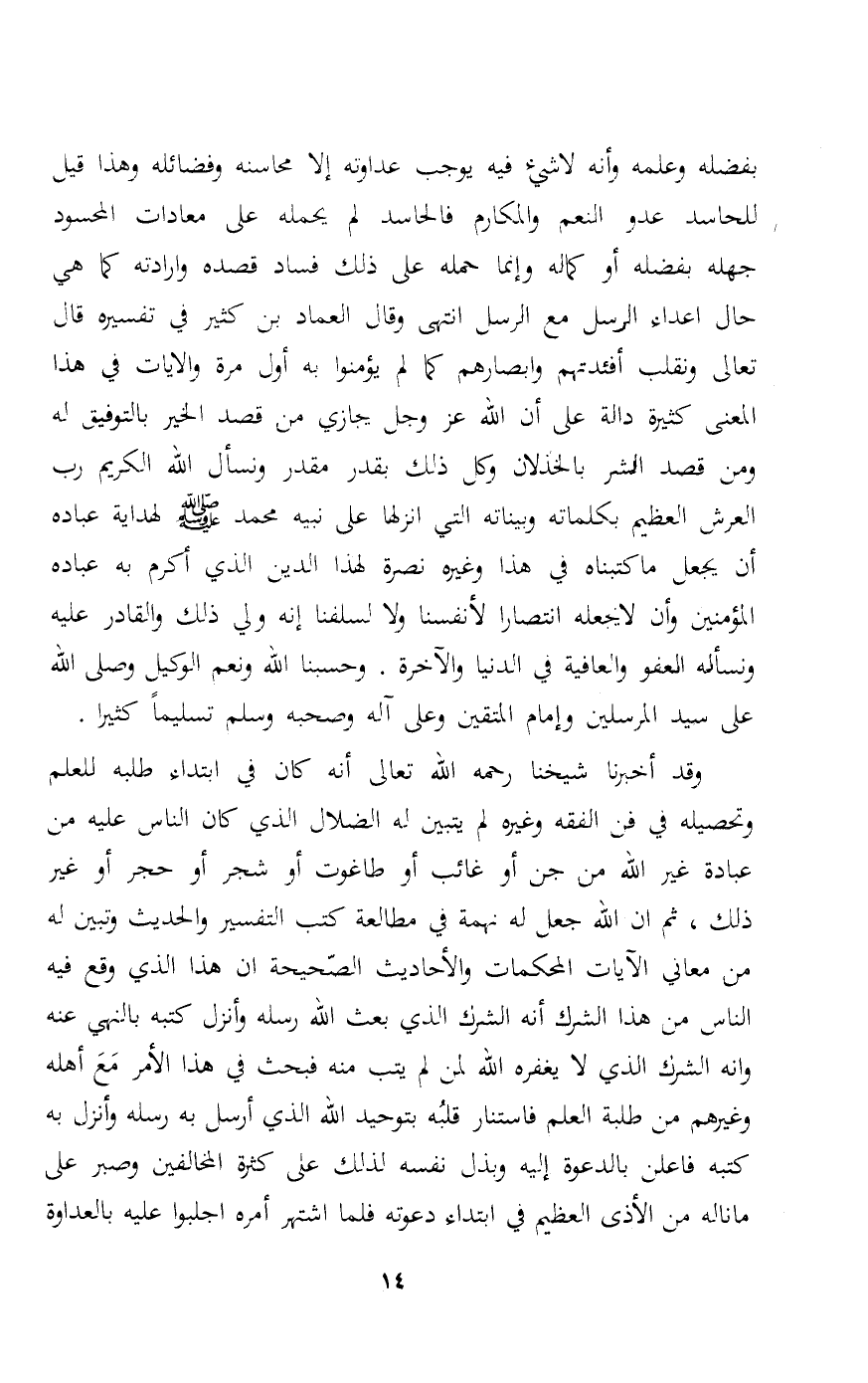 وقد أخبرنا شيخنا رحمه الله تعالى: أنه كان في ابتداء طلبه للعلم وتحصيله في فن الفقه وغيره لم يتبين له الضلال الذي كان الناس عليه من عبادة غير الله من جن أو غائب أوطاغوت أوشجر أوحجر أو غير ذلك ثم ان الله جعل له نهمة في مطالعة كتب التفسير والحديث وتبين له من معاني الآيات المحكمات والأحاديث الصحيحة ان هذا الذي وقع فيه الناس من هذا الشرك أنه الشرك الذي بعث الله رسله أونزل كتبه بالنهي عنه وانه الشرك الذي لايغفره الله لمن لم يتب منه فبحث في هذا الأمر مع أهله وغيرهم من طلبة العلم فاستنار قلبه بتوحيد الله الذي أرسل به رسله وأنزل به كتبه فأعلن بالدعوة وبذل نفسه لذلك على كثيرة المخالفين وصبر على ماناله من الأذى العظيم في ابتداء دعوته فلما اشتهر أمره اجلبوا عليه بالعداوة