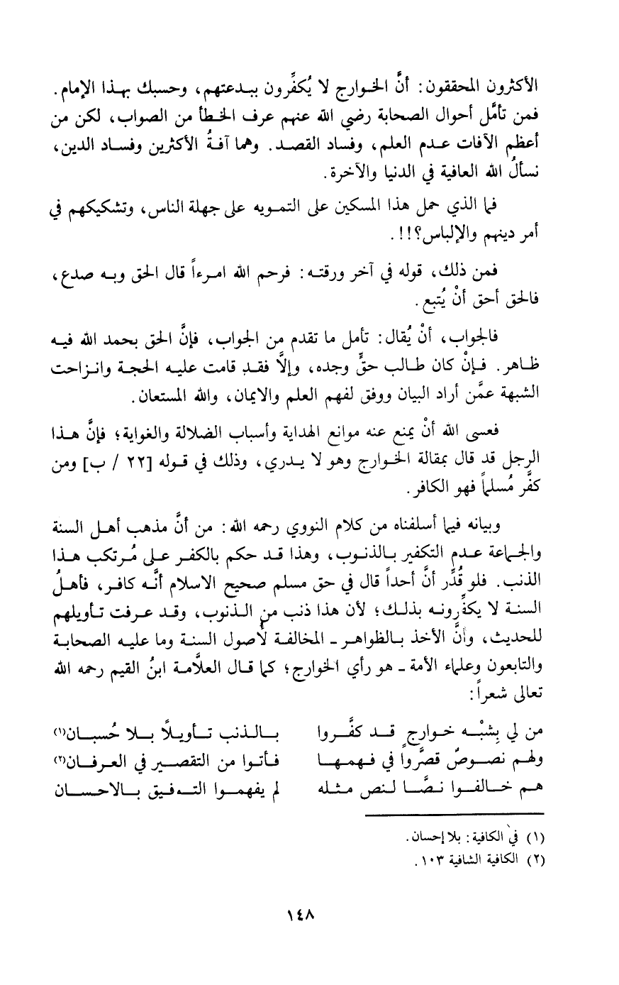 وبيانه فيما أسلفناه من كلام النووي رحمه الله: من أن مذهب السنة والجماعة عدم التكفير بالذنوب وهذا قد حكم بالكفر على مرتكب هذا الذنب فلو قدر أن أحد قال في حق مسلم صحيح الإسلام أنه كافر فأهل السنة لا يكفرونه بذلك لأن ذنب من الذنوب وقد عرفت تأويلهم للحد وأن الأخذ بالظواهر المخالفة لأصول السنة وما عليه الصحابة والتابعون وعلماء الأمة هو رأي الخوارج كما قال العلامة ابن القيم رحمه الله تعالى: شعرا: