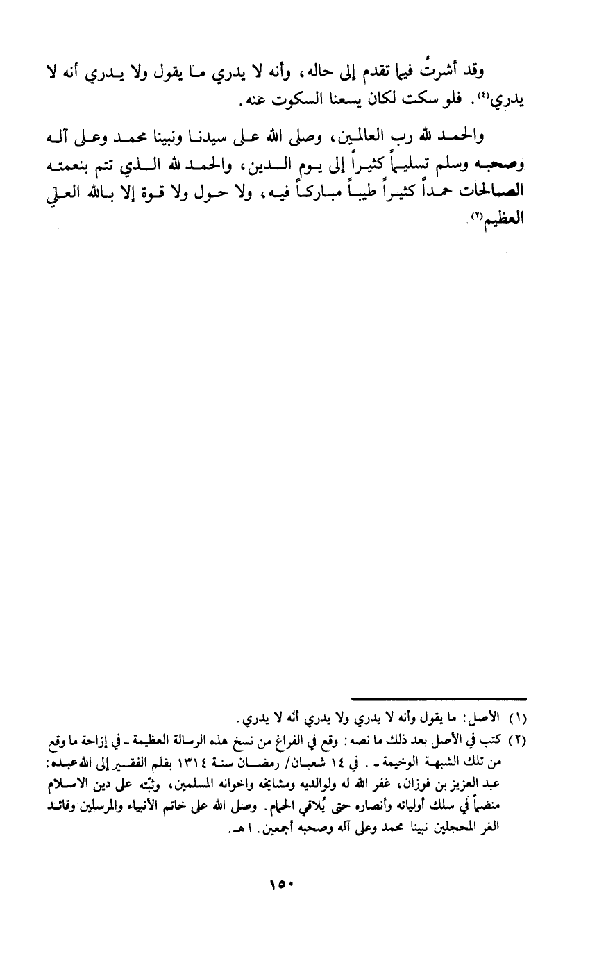 2 كتب الأصل بعد ذلك ما نصه: وقع في الفراغ من نسخة هذه الرسالة العظيمة – في إزاحة ما وقع من تلك الشبهة الوخيمة- في14 شعبان/ رمضان سنة 1314 بقلم الفقير إلى الله عبده: عبد العزيز بن فوزان غفر الله ولوالديه ومشايخه وإخوانه المسلمين وثبته على دين الإسلام منضما في سلك أوليائه وأنصاره حتى يلاقي الحمام. وصلى الله على خاتم الأنبياء والمرسلين وقائد الغر المحجلين نبينا محمد وعلى آله وصبه أجمعين. اهـ