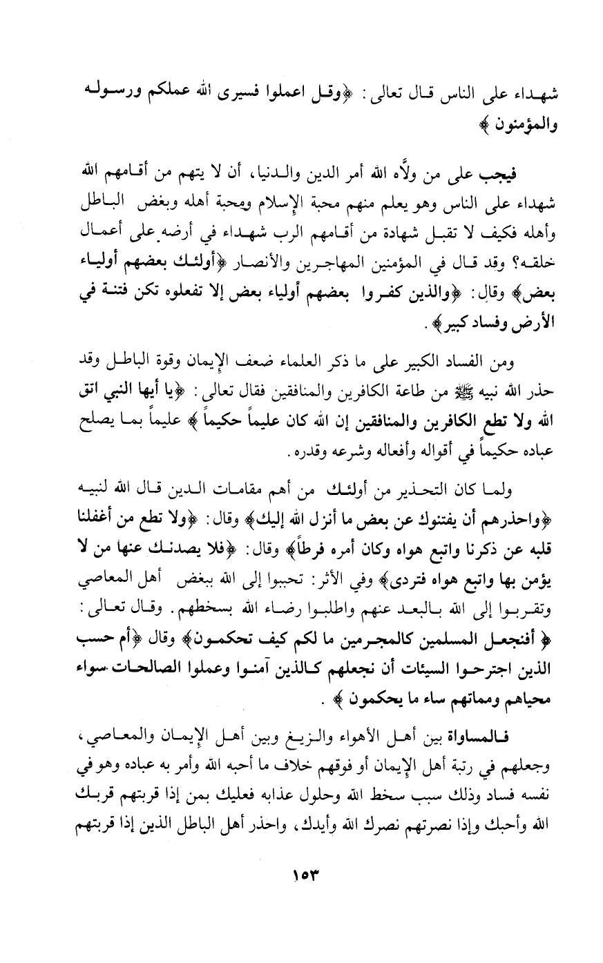 ولما كان التحذير من أولئك من أهم مقامات الدين قال الله لنبيه {وَاحْذَرْهُمْ أَنْ يَفْتِنُوكَ عَنْ بَعْضِ مَا أَنْزَلَ اللَّهُ إِلَيْكَ} وقال: {وَلا تُطِعْ مَنْ أَغْفَلْنَا قَلْبَهُ عَنْ ذِكْرِنَا وَاتَّبَعَ هَوَاهُ وَكَانَ أَمْرُهُ فُرُطاً} وقال: {فَلا يَصُدَّنَّكَ عَنْهَا مَنْ لا يُؤْمِنُ بِهَا وَاتَّبَعَ هَوَاهُ فَتَرْدَى} وفي الأثر "تحببوا إلى الله ببغض أهل المعاصي وتقربوا إلى الله بالبعد عنهم واطلبوا رضاء الله بسخطهم. وقال تعالى: {أَفَنَجْعَلُ الْمُسْلِمِينَ كَالْمُجْرِمِينَ مَا لَكُمْ كَيْفَ تَحْكُمُونَ} وقال: {أَمْ حَسِبَ الَّذِينَ اجْتَرَحُوا السَّيِّئَاتِ أَنْ نَجْعَلَهُمْ كَالَّذِينَ آمَنُوا وَعَمِلُوا الصَّالِحَاتِ سَوَاءً مَحْيَاهُمْ وَمَمَاتُهُمْ سَاءَ مَا يَحْكُمُونَ} .