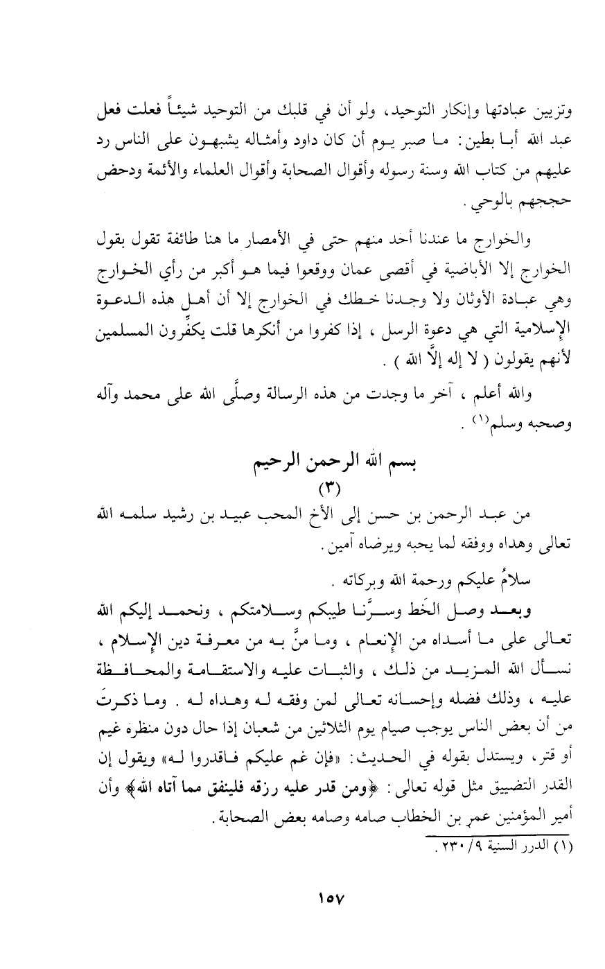 والخوارج ما عندنا أحد منهم حتى في الأمصار ما هنا طائفة تقول بقول الخوارج إلا الإباضية في أقص عمان ووقعوا فيما هو أكبر من رأي الخوارج وهي عبادة الأوثان ولا وجدنا خطك في الخوارج إلا أن أهل هذه الدعوة الإسلامية التي هي دعوة الرسل إذا كفروا من أنكرها قلت يكفرون المسلمين لأنهم يقولون "لا إله إلا الله".