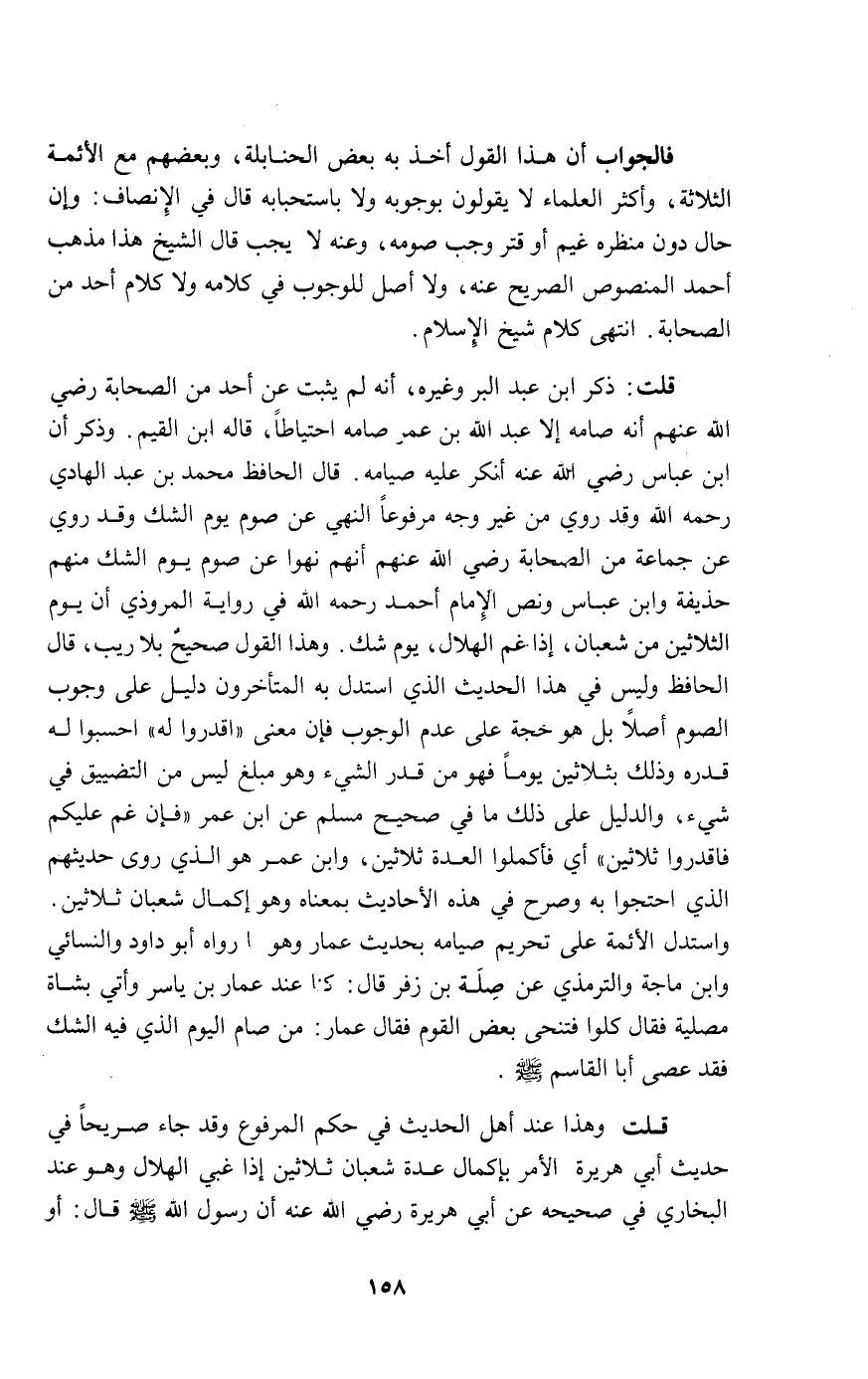 قلت ذكر ابن عبد البر وغيره أنه لم يثبت عن أحد من الصحابة رضي الله عنهم أنه صامه إلا عبد الله بن عمر صامه احتياطا قاله ابن القيم وذكر أن ابن عباس رضي الله عنه أنكر صيامه قال الحافظ محمد بن عبد الهادي رحمه الله: وقد روي من غير وجه مرفوعا النهي من صوم يوم الشك منهم وقد روي عن جماعة من الصحابة رضي الله عنهم أنهم نهوا عن صوم يوم الشك منهم حذيفة وابن عباس ونص الإمام أحمد رحمه الله: في رواية المروذي أن يوم الثلاثين من شعبان إذا غم الهلال يوم شك وهذا القول صحيح بلا ريب قال الحافظ وليس في هذا الحديث الذي استدل به المتأخرون دليل على وجوب الصوم بل هو حجة على عدم الوجوب فإن معنى "اقدورا له" احسبوا له قدره وذلك بثلاثين يوما فهو من قدر الشيء وهو مبلغ ليس من التضييق في شيء والدليل على ذلك ما في صحيح مسلم عن ابن عمر "فإن غم عليكم فاقدروا ثلاثين" أي فأكملوا العدة ثلاثين وابن عمر هو الذي روى حديثهم الذي احتجوا به وصرح في هذه الأحاديث بمعناه وهو إكمال شعبان ثلاثين واستدل الأئمة على تحريم صيامه بحديث عمار وهو رواه أبو داود والنسائي وابن ماجة والترمذي عن صلة بن زفر قال كنا عند عمار بن ياسر وأتي بشاه مصلية فقال كلوا فتنحى بعض القوم فقال عمار: من صام اليوم الذي فيه الشك فقد عصى أبا القاسم صلى الله عليه وسلم.