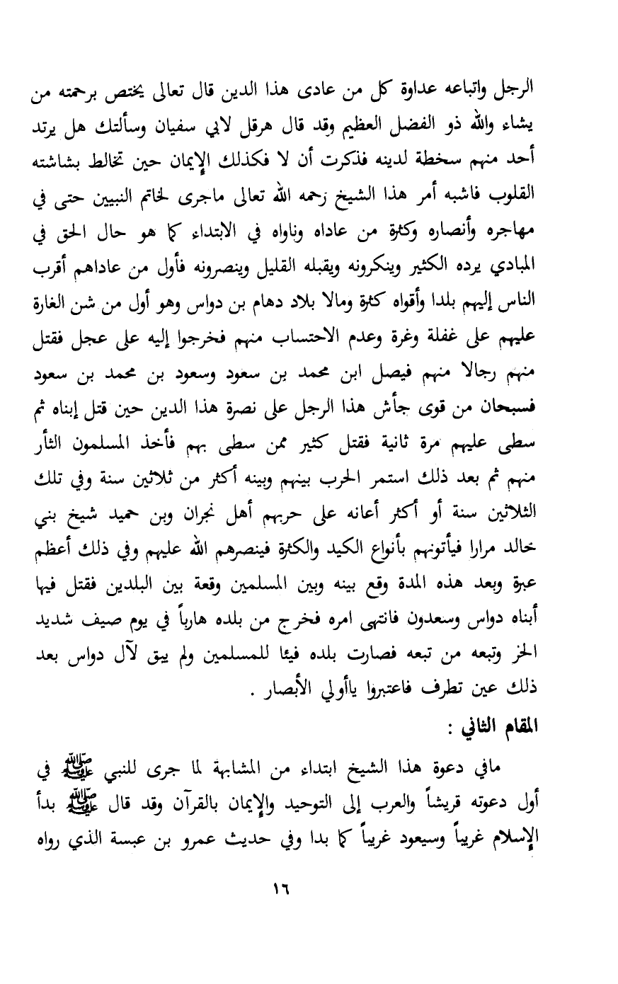 الرجل وأتباعه عداوة كل من عادى هذا الدين قال تعالى: {يَخْتَصُّ بِرَحْمَتِهِ مَنْ يَشَاءُ وَاللَّهُ ذُو الْفَضْلِ الْعَظِيمِ} وقد قال هرقل لأبي سفيان وسألتك هل يرتد أحد منهم سخطة لدينه فذكرت أن لا فكذلك الإيمان حين تخالط بشاشته القلوب فأشبه أمر هذا الشيخ رحمه الله تعالى: ما جرى لخاتم النبيين حتى في مهاجره وأنصاره وكثيرة من عاداه وناواه في الابتداء كما هوحال الحق في المبادي يرده الكثير وينكرونه ويقبله القليل وينصرونه فأول من عاداهم أقرب الناس إليهم بلدا وأقواه كثيرة ومالا بلاد دهام بن دواس وهو أول من شن الغارة عليهم على غفلة وغرة وعدم الاحتساب منهم فخرجوا إليه على عجل فقتل منهم رجالا منهم فيصل ابن محمد بن سعود وسعود بن محمد بن سعود فسبحان من قوى جأش هذ الرجل على نصرة هذا الدين حين قتل إبناه ثم سطى عليهم مرة ثانية فقتل كثير ممن سطى بهم فأخذ المسلمون الثار منهم ثم بعد ذلك استمر الحرب بينهم وبينه أكثر من ثلاثين سنة وفي تلك الثلاثين سنة أو أكثر أعانه على حربهم أهل نجران وبن حميد شيخ بن خالد مرارا فيأتونهم بأنواع الكيد والكثرة فينصرهم الله عليهم وفي ذلك أعظم عبرة وبعد هذه المدة وقع بينه وبين المسلمين وقعة بين البلدين فقتل فيها أبناءه دواس وسعدون فانتهى أمره فخرج من بلده هاربا في يوم صيف شديد الحر وتبعه من تبعه فصارت بلده فيئا للمسلمين ولم يبق لآل دواس بعد ذلك عين تطرف فاعتبروا يا أولي الأبصار.