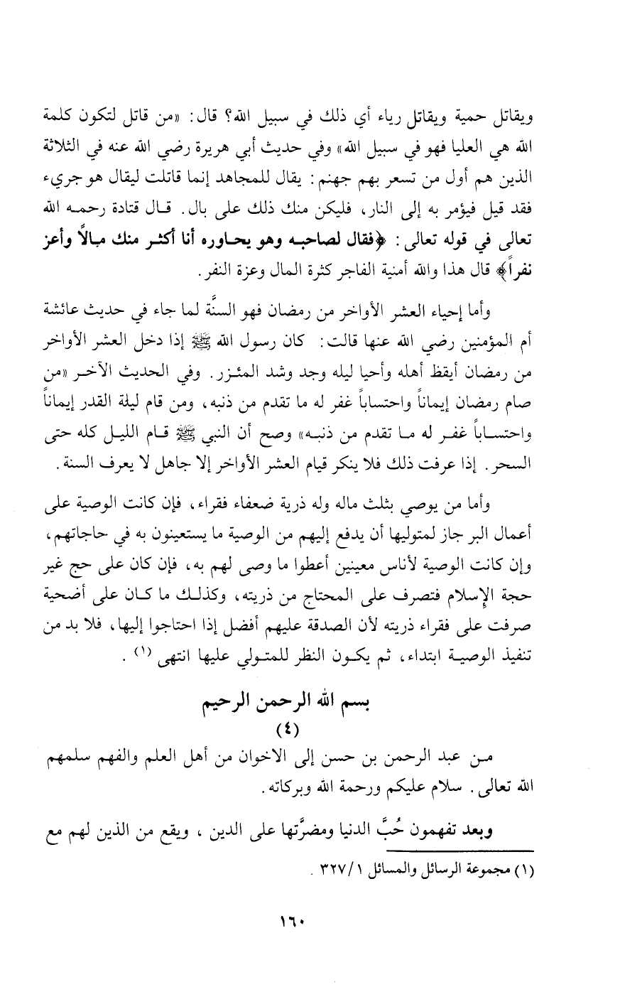 من عبد الرحمن بن حسن إلى الأخوان من أهل العلم والفهم سلمهم الله تعالى سلام عليكم ورحمته الله وبركاته.