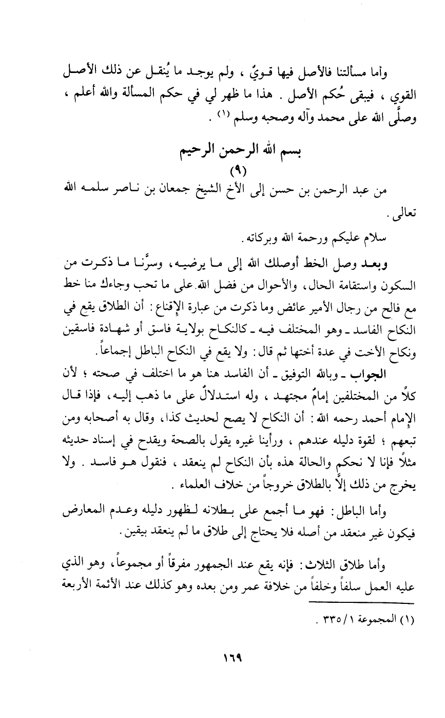 وبعد وصل الخط أوصلك الله إلى ما يرضيه وسرنا ما ذكرت من السكون واستقامة الحال والأحوال من فضل الله على ما تحب وجاءك منا خط مع فالح من رجال الأمير عائض وما ذكرت من عبارة الإقناع: أن الطلاق يقع في النكاح الفاسد – وهو المختلف فيه- كالنكاح بولاية فاسق أو شهادة فاسقين ونكاح الأخت في عدة أختها ثم قال ولا يقع في النكاح الباطل إجماعا.