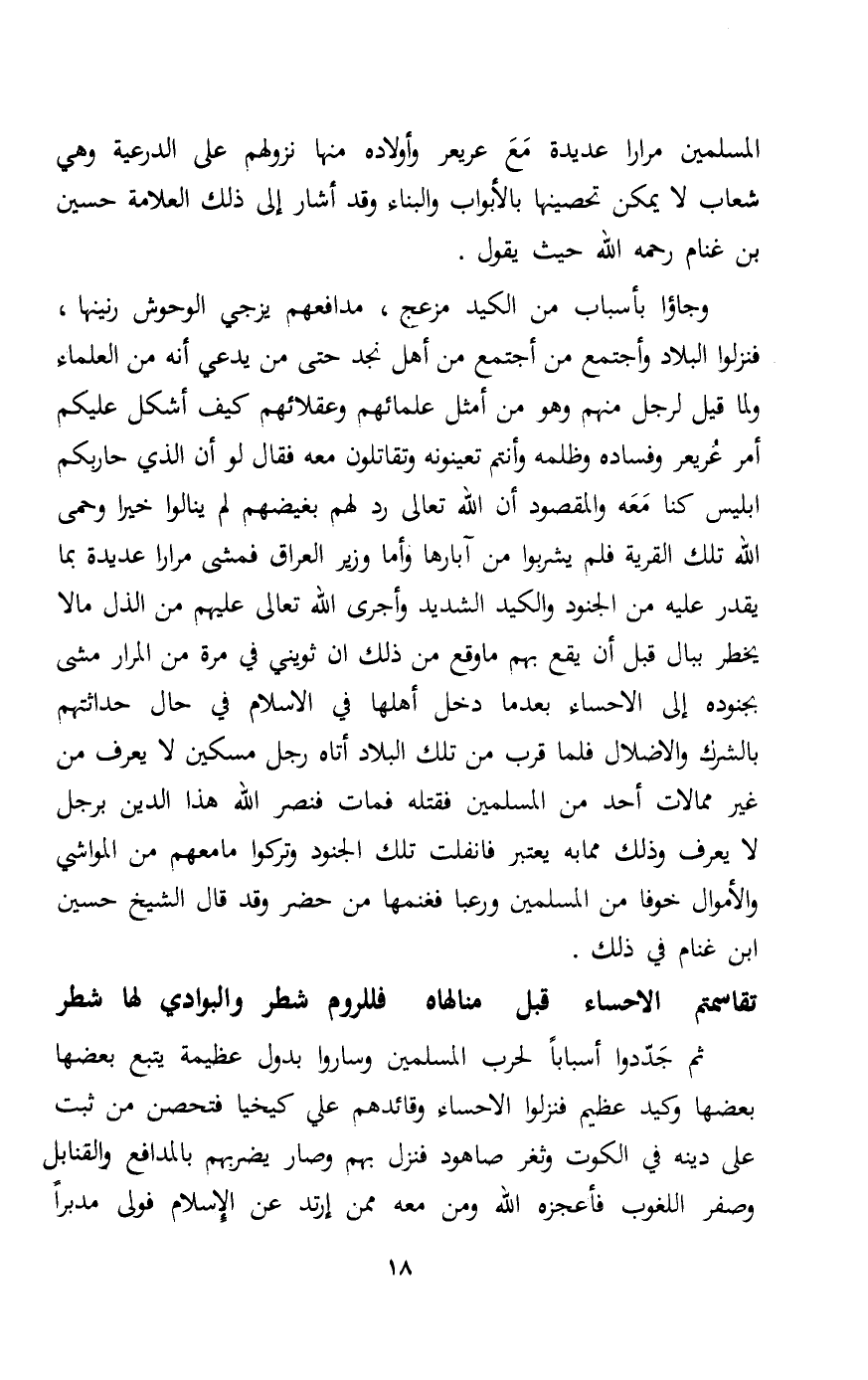 وجاؤا بأسباب من الكيد مزعج مدافعهم يزجي الوحوش رنينها فنزلوا البلاد وأجتمع من أجتمع من اهل نجد حتى من يدعي أنه من العلماء ولما قيل لرجل منهم وهو من أمثل علمائهم وعقلائهم كيف أشكل عليكم أمر عريعر وفساده وظلمه وأنتم تعينونه وتقاتلون معه فقال لوأن الذي حاربكم إبليس كنا معه والمقصود أن الله تعالى رد لهم بغيضهم لم ينالوا خيرا وحمى الله تلك القرية فلم يشربوا من آبارها وأما وزير العراق فمشى مرارا عديدة بما يقدر عليه من الجنود والكيد الشديد وأجرى الله تعالى عليهم من الذل مالا يخطر ببال قبل أن يقع بهم ما وقع من ذلك أن ثويني في مرة من المرار مشى بجنوده إلى الإحساء بعدما دخل أهلها في الإسلام في حال حداثتهم بالشرك والاضلال فلما قرب من تلك البلاد أتاه رجل مسكين لا يعرف من غير ممالات أحد من المسلمين فقتله فمات فنصر الله هذا الدين برجل لا يعرف وذلك مما به يعتبر فانفلت تلك الجنود وتركوا مامعهم من المواشي والأموال خوفا من المسلمين ورعبا فغنمها من حضر وقد قال الشيخ حسين ابن غنام في ذلك.