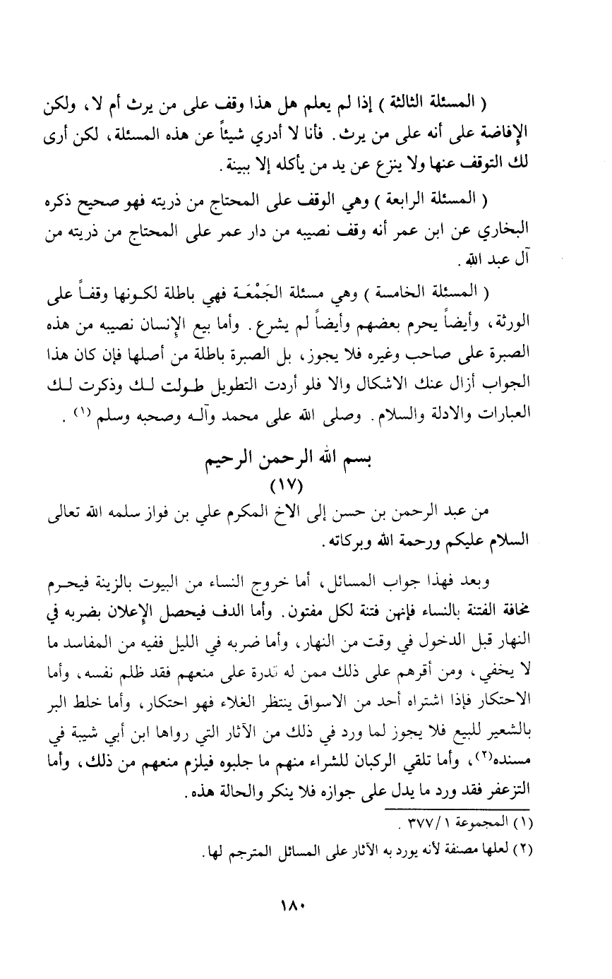 "المسألة الخامسة" وهي مسألة الجمعة فهي باطلة لكونها وقفا على الورثة وأيضا يحرم بعضهم وأيضا لم يشرع. وأما بيع الإنسان نصيبه من هذه الصبرة على صاحب وغيره فلا يجوز بل الصبرة باطلة من أصلها فإن كان هذا الجواب أزال عنك الاشكال وإلا فلو أردت التطويل طولت لك وذكرت لك العبارات والأدلة والسلام.