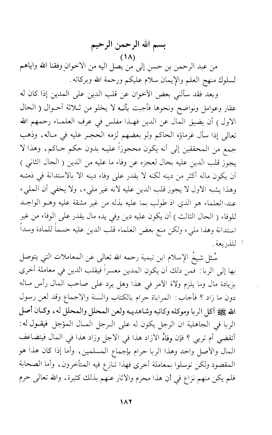 من عبد الرحمن بن حسن إلى من يصل إليه من الأخوان وفقنا الله وإياهم لسلوك منهج العلم والإيمان سلام عليكم ورحمة الله وبركاته: