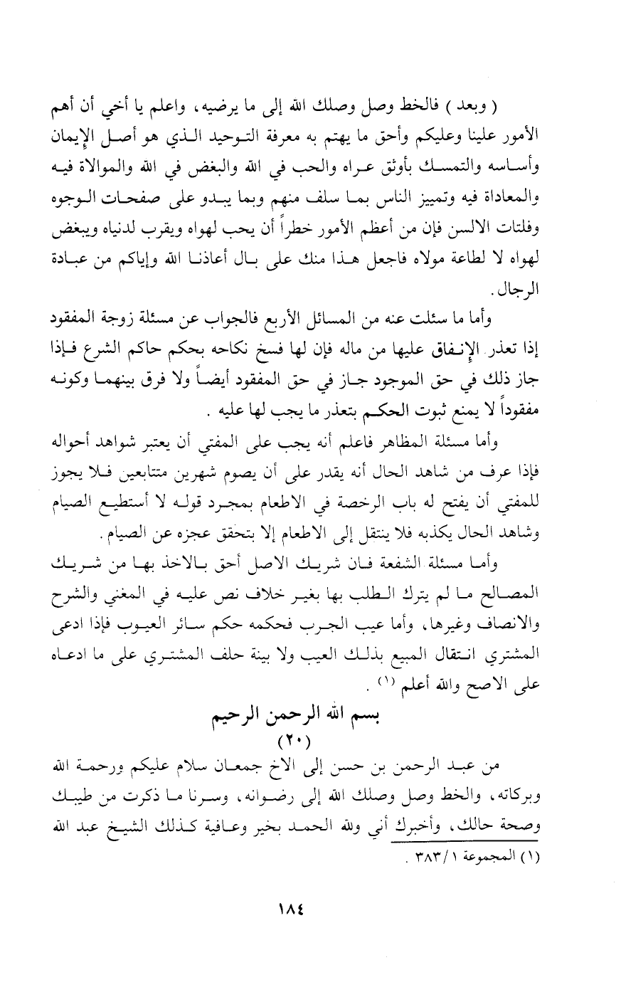 من عبد الرحمن بن حسن إلى الأخ جمعان سلام عليكم ورحمة الله وبركاته والخط وصل وصلك الله إلى رضوانه وسرنا ما ذكرت من طيبك وصحة حالك وأخبرك أني والله الحمد بخير وعافية كذلك الشيخ عبد الله: