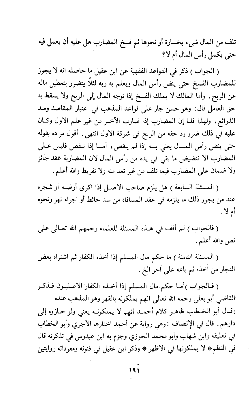 تلف من المال شيء بخسارة أو نحوها ثم فسخ المضارب هل عليه أن يعمل فيه حتى يكمل رأس المال أم لا "الجواب" ذكر في القواعد الفقهية عن ابن عقيل ما حاصله انه لا يجوز للمضارب الفسخ حتى ينض رأس المال ويعلم به ربه لئلا يتضرر بتعطيل ماله عن الربح وأما المالك لا يملك الفسخ إذا توجه المال الربح ولا يسقط به حق العامل قال: وهو حسن جار على قواعد المذهب في اعتبار المقاصد وسد الذرائع ولهذا قلنا إن ضارب الآخر من علم الأول وكان عليه في ذلك ضرر رد حقه من الربح في شركة الأول انتهى أقول مراده بقوله: حتى ينض رأس المال يعني به إذا لم ينقص أما إذا نقص فليس على المضارب إلا تنضيض ما بقي في يده من رأس المال لان المضاربة عقد جائز ولا ضمان على المضارب فيما تلف من غير تعد منه ولا تفريط والله أعلم.