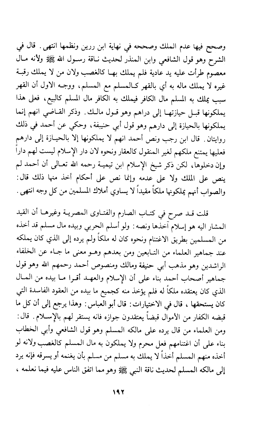 قال في الشرح وهو قول الشافعي وابن المنذر لحديث ناقة رسول الله صلى الله عليه وسلم ولأنه مال معصوم طرأت عليه يد عادية فلم يملك بها كالغصب ولأن من لا يملك رقبة غيره لا يملك ماله به أي بالقهر كالمسلم مع المسلم ووجه الأول أن القهر سبب يملك به المسلم مال الكافر فيملك به الكافر مال المسلم كالبيع فعلى هذا يملكونها قبل حيازتها إلى دراهم وهو قول مالك. وذكر القاضي أنهم إنما يملكونها بالحيازة إلى دارهم وهو قول أبي حنيفة وحكي عن أحمد في ذلك روايتان قال ابن رجب ونص أحمد أنهم لا يملكونها إلا بالحيازة إلى دراهم فعليها يمتنع ملكهم لغير المنقول كالعقار ونحوه لأن دار الإسلام ليست لهم دارا وإن دخلوها لكن ذكر شيخ الإسلام ابن تيمية رحمه الله تعالى: أن أحمد لم ينص على الملك ولا على عدمه وإنما نص على أحكام أخذ منها ذلك قال: والصواب أنهم يملكونها ملكا مقيدا لا يساوي أملاك المسلمين من كل وجه انتهى.