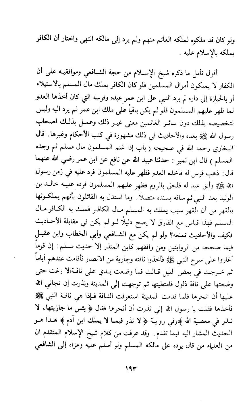 أقول تأمل ما ذكره شيخ الإسلام من حجة الشافعي وموافقيه على أن الكفار لا يملكون أموال المسلمين فلو كان الكافر يملك مال المسلم بالاستيلاء أو بالحيازة إلى داره لم يرد النبي على ابن عمر عبده وفرسه التي كان أخذها العدو لما ظهر عليهم المسلمون فلو لم يكن باقيا على ملك ابن عمر لم يرد إليه وليس لتخصيصه بذلك دون شائر الغانمين معنى غير ذلك وعمل بذلك أصحاب رسول الله صلى الله عليه وسلم بعده والأحاديث في ذلك مشهورة في كتب الأحكام وغيرها قال البخاري رحمه الله: في صحيحه "باب إذا غنم المسلمون مال مسلم ثم وجده المسلم" قال ابن نمير حدثنا عبيد الله عن نافع عن ابن عمر رضي الله عنهما قال: ذهب فرس له فأخذه بالروم فظهر عليهم المسلمون فرده عليه خالد بن الوليد بعد النبي ثم ساقه بسنده متصلا. وما استدل به القائلون بأنهم يملكونها بالقهر من أن القهر سبب يملك به المسلم مال الكافر فملك به الكافر مال المسلم فهذا قياس مع الفارق لا يصح دليلا لو لم يكن في مقابلة الأحاديث فكيف والأحاديث تمنعه؟ ولو لم يكن مع الشافعي وأبي الخطاب وابن عقيل فيما صححه من الروايتين ومن وافقهم كابن المنذر إلا حديث مسلم: إن قوما أغاروا على سرح النبي صلى الله عليه وسلم فأخذوا ناقته وجارية من الأنصار فأقامت عندهم أياما ثم خرجت في بعض الليل قالت فما وضعت يدي على ناقة إلا رغت حتى وضعتها على ناقة ذلول فامتطيتها ثم توجهت إلى المدينة ونذرت إن نجاني الله عليها أن أنحرها فلما قدمت المدينة استعرفت الناقة فإذا هي ناقة النبي صلى الله عليه وسلم فأخذها فقلت يا رسول الله إني نذرت أن أنحرها فقال: "بئس ما جازيتها لا نذر في معصية الله" وفي رواية "لا نذر فيما لا يملك ابن آدم" هذا هو الحديث المشار إليه فيما تقدم. وقد عرفت من كلام شيخ الإسلام المتقدم أن من العلماء من قال يرده على مالكه المسلم ولو أسلم عليه وعزاه إلى الشافعي