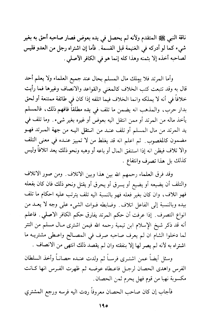 وأما المرتد فلا يملك مال المسلم بحال عند جميع العلماء ولا يعلم أحد قال به وقد تتبعت كتب الخلاف كالمغني والقواعد والإنصاف وغيرها فما رأيت خلافا في أنه لا يملكه وإنما الخلاف فيما أتلفه إذا كان في طائفة ممتنعة أو لحق بدار حرب والمذهب أنه يضمن ما تلف في يده مطلقا فافهم ذلك فالمسلم يأخذ ماله من المرتد أو ممن انتقل إليه بعوض أو غيره بغير شيء.