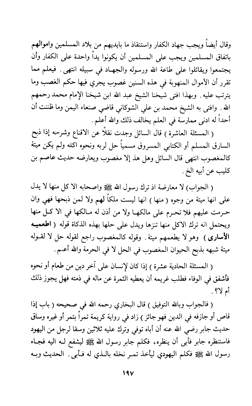 وقال أيضا ويجب جهاد الكفار واستنقاذ ما بأيديهم من بلاد المسلمين وأموالهم باتفاق المسلمين ويجب على المسلمين أن يكونوا يدا واحدة على الكفار وأن يجتمعوا ويقاتلوا على طاعة الله ورسوله والجهاد في سبيله انتهى. فيعلم مما تقرر أن الأموال المنهوبة في هذه السنن غصوب يجري فيها حكم الغصب وما يترتب عليه.