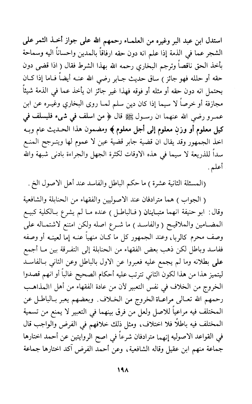 "الجواب" هما مترادفان عند الأصوليين والفقهاء من الحنابلة والشافعية وقال: أبو حنيفة أنهما متباينان "فالباطل" عنده ما لم يشرع بالكلية كبيع المضامين والملاقيح "الفاسد" ما شرع اصله ولكن امتنع لاشتماله على وصف محرم كالربا وعند الجمهور كل ما كان منهيا عنه إما لعينه أو وصفه ففاسد وباطل لكن ذهب بعض الفقهاء من الحنابلة إلى التفرقة بين ما أجمع على بطلانه وما لم يجمع عليه فعبروا عن الأول بالباطل وعن الثاني بالفاسد ليتميز هذا من هذا لكون الثاني تترتب عليه أحكام الصحيح غالبا أو أنهم قصدوا الخروج من الخلاف في نفس التعبير لأن من عادة الفقهاء من أهل المذاهب رحمهم الله تعالى مراعاة الخروج من الخلاف وبعضهم يعبر بالباطل عن المختلف فيه مراعيا للأصل ولعل من فرق بينهما في التعبير لا يمنع من تسمية المختلف فيه باطلا فلا اختلاف ومثل ذلك خلافهم في الفرض والواجب قال في القواعد الأصوليه إنها مترادفان شرعا في اصح الروايتين عن أحمد اختارها جماعة منهم ابن عقيل وقاله الشافعية وعن أحمد الفرض آكد اختارها جماعة.