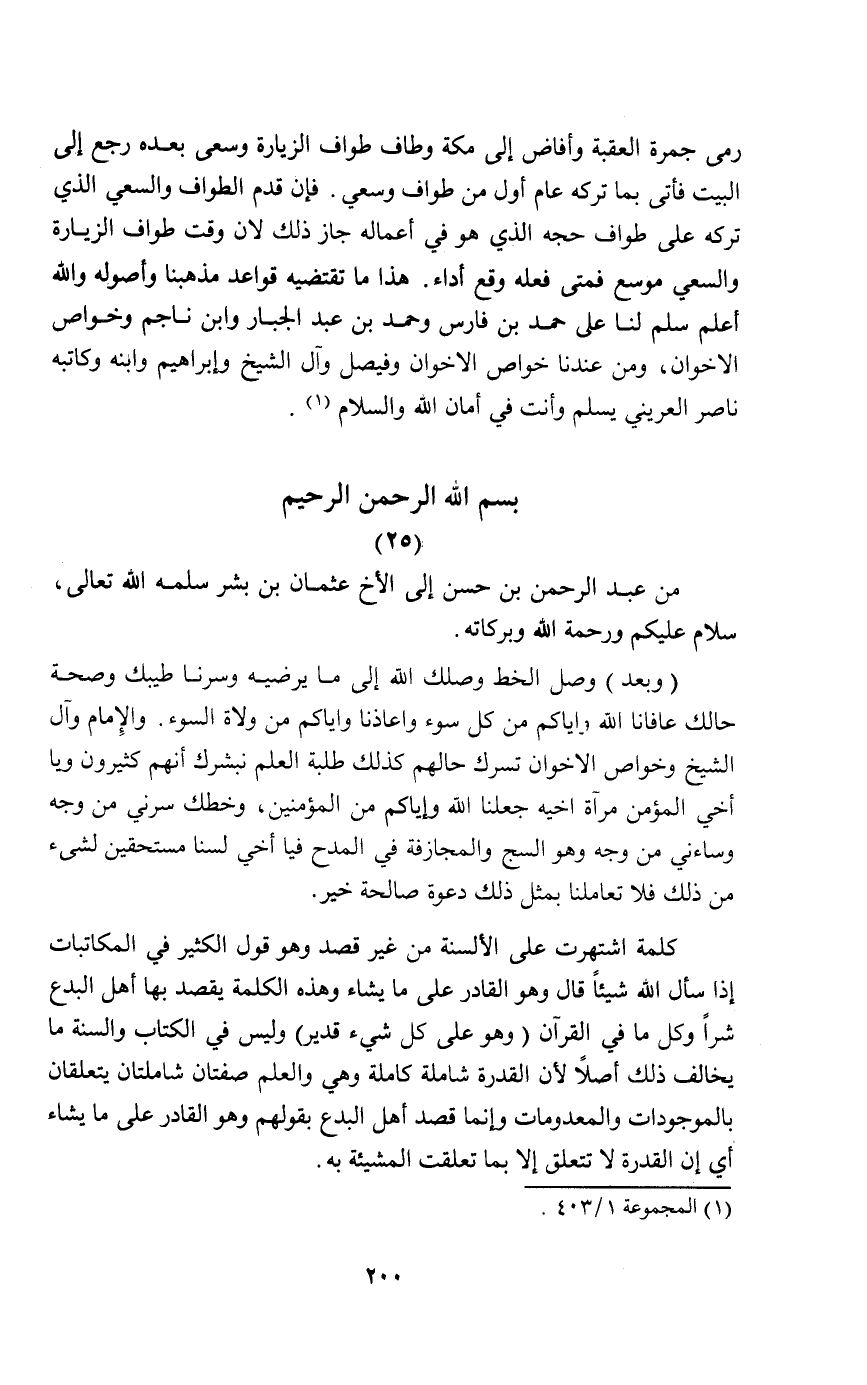 رمي جمرة العقبة وأفاض إلى مكة وطاف الزيارة وسعى بعده رجع إلى البيت فأتى بما تركه عام أول من طواف وسعى. فإن قدم الطواف والسعي الذي تركه على طواف حجه الذي هو في اعماله جاز ذلك لان وقت طواف الزيارة والسعي موسع فمتى فعله وقع أداء. هذا ما تقتضيه قواعد مذهبنا وأصوله والله أعلم سلم لنا على حمد بن فارس وحمد بن عبد الجبار وابن ناجم وخواص الإخوان ومن عندنا خواص الأخوان وفيصل وآل الشيخ وإبراهيم وابنه وكاتبه ناصر العريني يسلم وأنت في أمان الله والسلام1