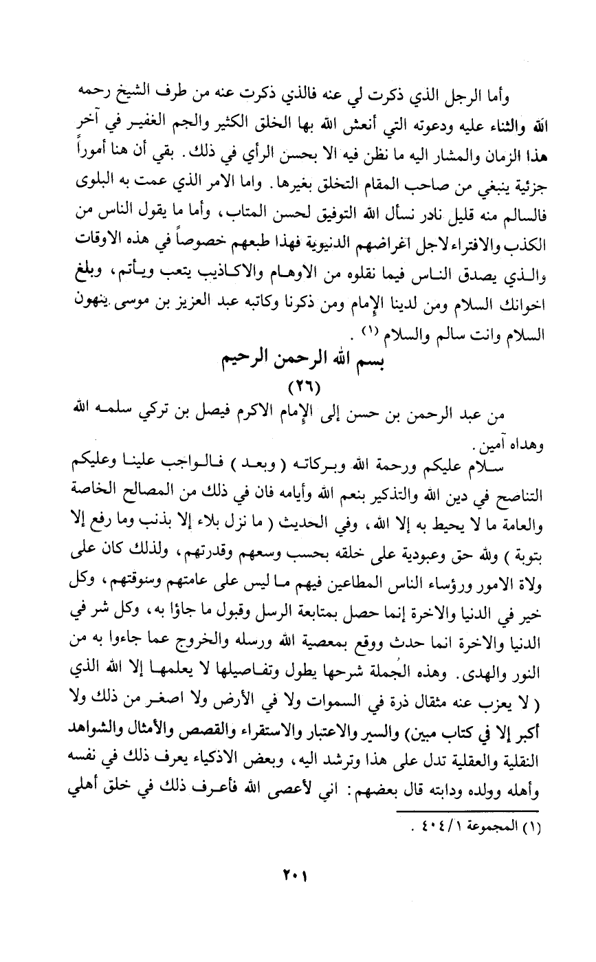 سلام عليكم ورحمة الله وبركاته "وبعد" فالواجب علينا وعليكم التناصح في دين الله والتذكير بنعم الله وأيامه فإن ذلك من المصالح الخاصة والعامة ما لا يحيط به إلا الله وفي الحديث "مانزل بلاء إلا بذنب وما رفع إلا بتوبة" ولله حق وعبودية على خلقه بحسب وسعهم وقدرتهم ولذلك كان على ولاة الامور ورؤساء الناس المطاعين فيهم ما ليس عامتهم وسوقتهم وكل خير في الدنيا والآخرة إنما حصل بمتابعة الرسل وقبول ما جاؤا به وكل خير في الدنيا والآخرة إنما حصل بمتابعة الرسل وقبول ما جاؤا به وكل شر في الدنيا والآخرة إنما حدث ووقع بمعصية الله ورسله والخروج عما جاءوا به من النور والهدى. وهذه الجملة شرحها يطول وتفاصيلها لا يعلمها إلا الله الذي {لاَ يَعْزُبُ عَنْهُ مِثْقَالُ ذَرَّةٍ فِي السَّمَاوَاتِ وَلاَ فِي الأَرْضِ وَلاَ أَصْغَرُ مِنْ ذَلِكَ وَلاَ أَكْبَرُ إِلاَّ فِي كِتَابٍ مُبِينٍ} والسير والاعتبار والاستقراء والقصص والأمثال والشواهد النقلية والعقلية تدل على هذا وترشد إليه وبعض الأذكياء يعرف ذلك في نفسه وأهله وولده ودابته قال بعضهم: إني لأعصي الله فأعرف ذلك في خلق أهلي