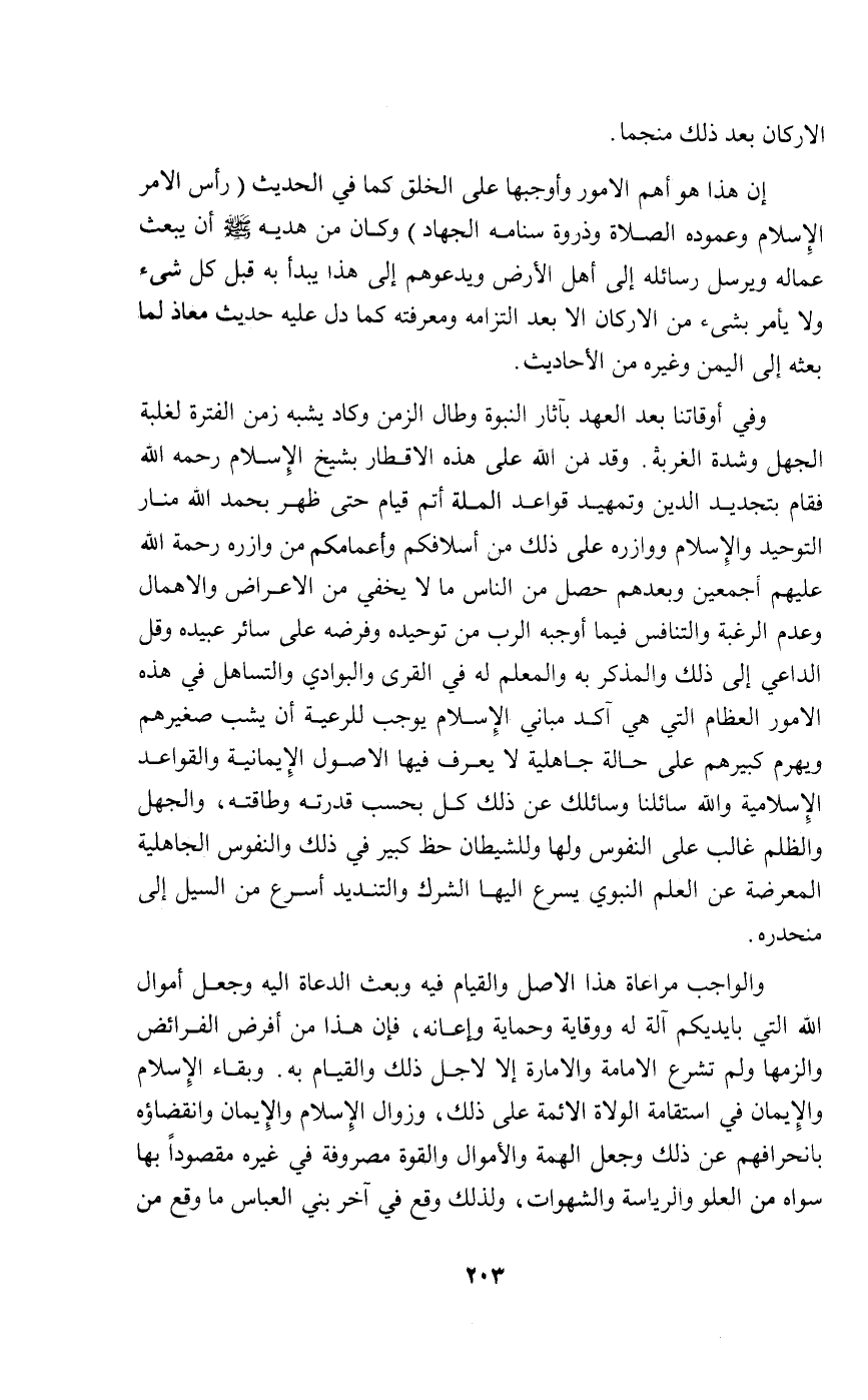 وفي أوقاتنا بعد العهد بآثار النبوة وطال الزمن وكاد يشبه زمن الفترة لغلبة الجهل وشدة الغربة. وقد من الله على هذه الأقطار بشيخ الإسلام رحمه الله: فقام بتجديد الدين وتمهيد قواعد الملة أتم قيام حتى ظهر بحمد الله منار التوحيد والإسلام ووازره على ذلك من أسلافكم وأعمالكم من وازره رحمة الله عليهم أجمعين وبعدهم حصل من الناس ما لا يخفى من الأعراض والإهمال وعدم الرغبة والتنافس فيما أوجبه الرب من توحيده وفرضه على سائر عبيده وقل الداعي إلى ذلك والمذكر به والمعلم له في القري والبوادي والتساهل في هذه الأمور العظام التي هي آكد مباني الإسلام يوجب للرعية أن يشب صغيرهم ويهرم كبيرهم على حالة جاهلية لا يعرف فيها الأصول الإيمانية والقواعد الإسلامية والله سائلنا وسائلك عن ذلك كل بحسب قدرته وطاقته والجهل والظلم غالب على النفوس ولها وللشيطان حظ كبير في ذلك والنفوس الجاهلية المعرضة عن العلم النبوي يسرع إليها الشرك والتنديد أسرع من السيل إلى منحدره.