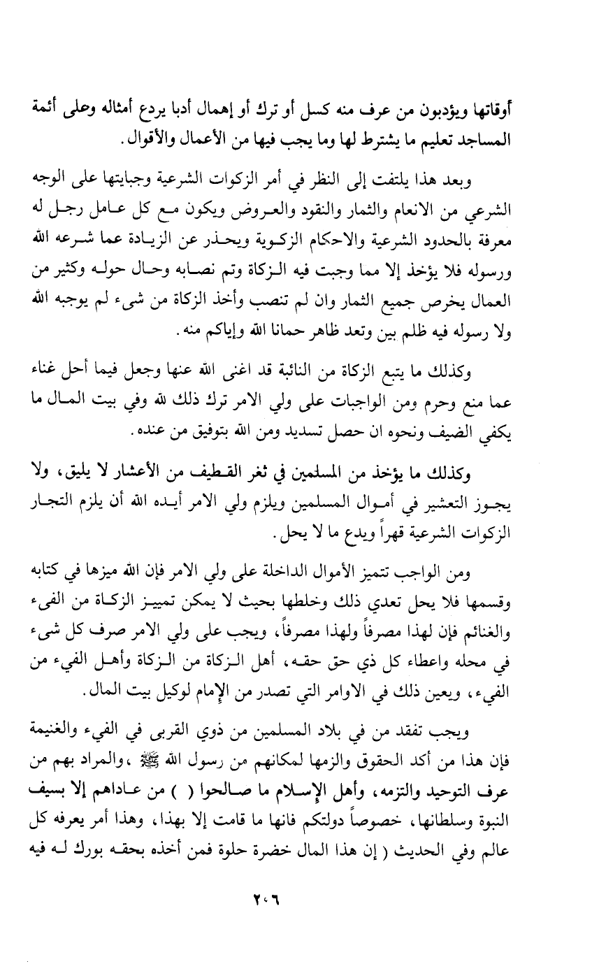 وبعد هذا يلتفت إلى النظر في أمر الزكوات الشرعية وجبايتها علىالوجه الشرعي من الأنعام والثمار والنقود والعروض ويكون مع كل عامل رجل له معرفة بالحدود الشرعية والأحكام الزكوية ويحذر عن الزيادة عما شرعه الله ورسوله فلا يؤخذ إلا مما وجبت فيه الزكاة وتم نصابه وحال حوله وكثير من العمال يخرص جميع الثمار وإن لم تنصب وأخذ الزكاة من شيء لم يوجبه الله ولا رسوله فيه ظلم بين وتعد ظاهر حمانا الله وإياكم منه.