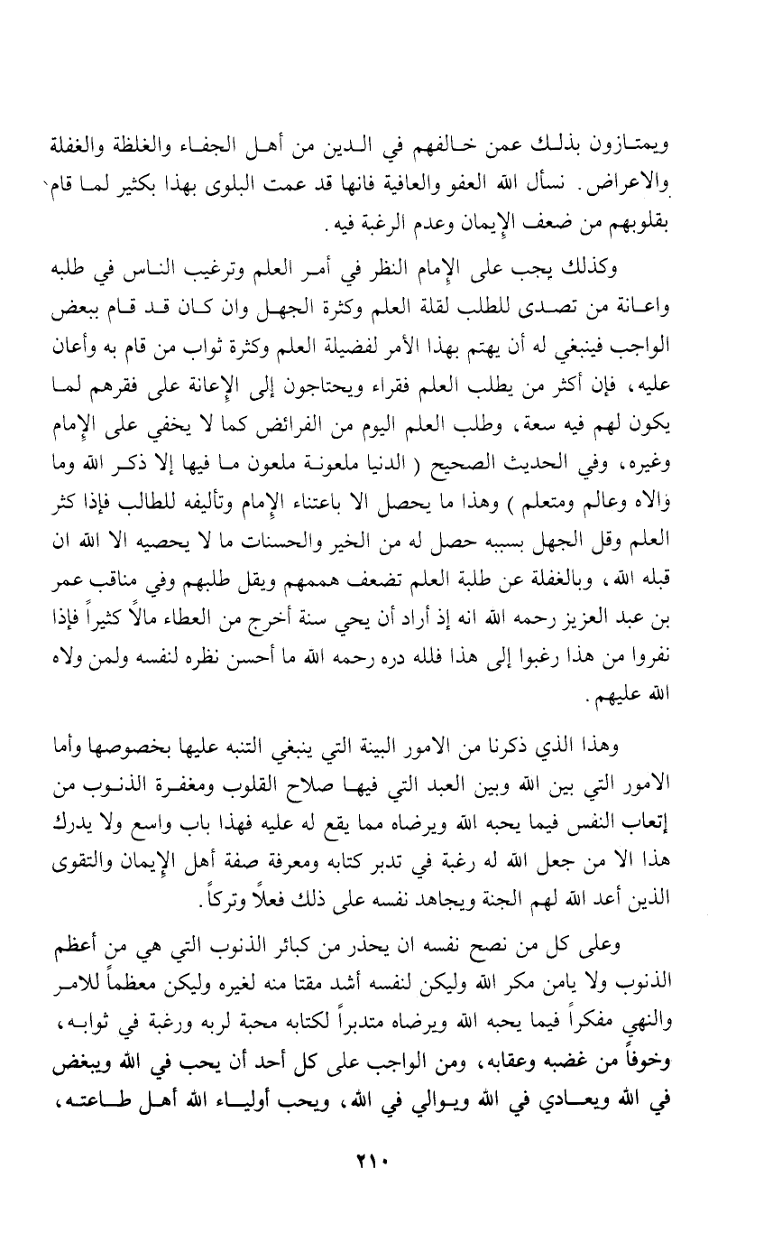 وكذلك يجب على الإمام النظر في أمر العلم وترغيب الناس في طلبه وإعانة من تصدى للطلب لقلة العلم وكثرة الجهل وإن كان قد قام ببعض الواجب فينبغي له أن يهتم بهذا الأمر لفضيلة العلم وكثرة ثواب من قام به وأعان عليه فإن أكثر من يطلب العلم فقراء ويحتاجون إلى الإعانة على فقرهم لما يكون لهم فيه سعة وطلب العلم اليوم من الفرائض كما لا يخفى على الإمام وغيره وفي الحديث الصحيح "الدنيا ملعونة ملعون ما فيها إلا ذكر الله وما والاه وعالم ومتعلم" وهذا ما يحصل إلا باعتناء الإمام وتأليفه للطالب فإذا كثر العلم وقل الجهل بسببه حصل له من الخير والحسنات مالا يحصيه إلا الله إن قبله الله وبالغفلة عن طلبة العلم تضعف هممهم ويقل طلبهم وفي مناقب عمر بن عبد العزيز رحمه الله: إنه إذا أراد أن يحي سنة أخرج من العطاء مالا كثيرا فإذا نفروا من هذا رغبوا إلى هذا فلله دره رحمه الله: ما أحسن نظره لنفسه ولمن ولاه الله عليهم.